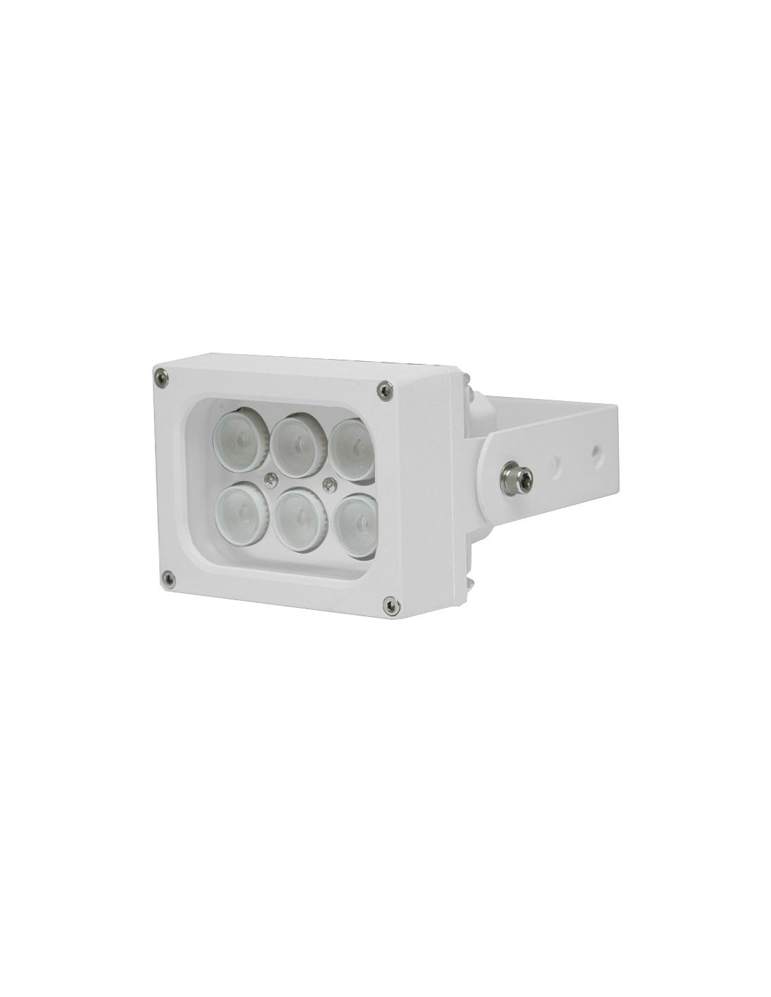 Foco de iluminación blanca. Alcance de 60 metros, 45°. Construcción robusta para exteriores. La carcasa de aluminio otorga alta conductividad térmica. Panel de vidrio templado. Incluye soporte de lira orientable