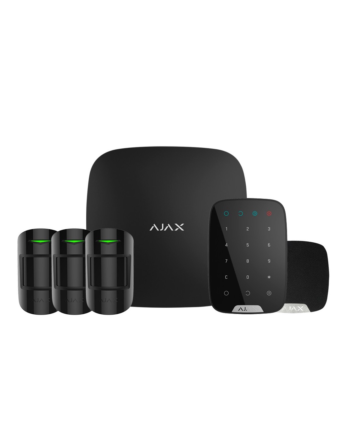 El kit incluye el panel de control AJ-HUB-B, 3 detectores de movimiento AJ-MOTIONPROTECT-B, un teclado inalámbrico AJ-KEYPAD-B y una sirena interior AJ-HOMESIREN-B.