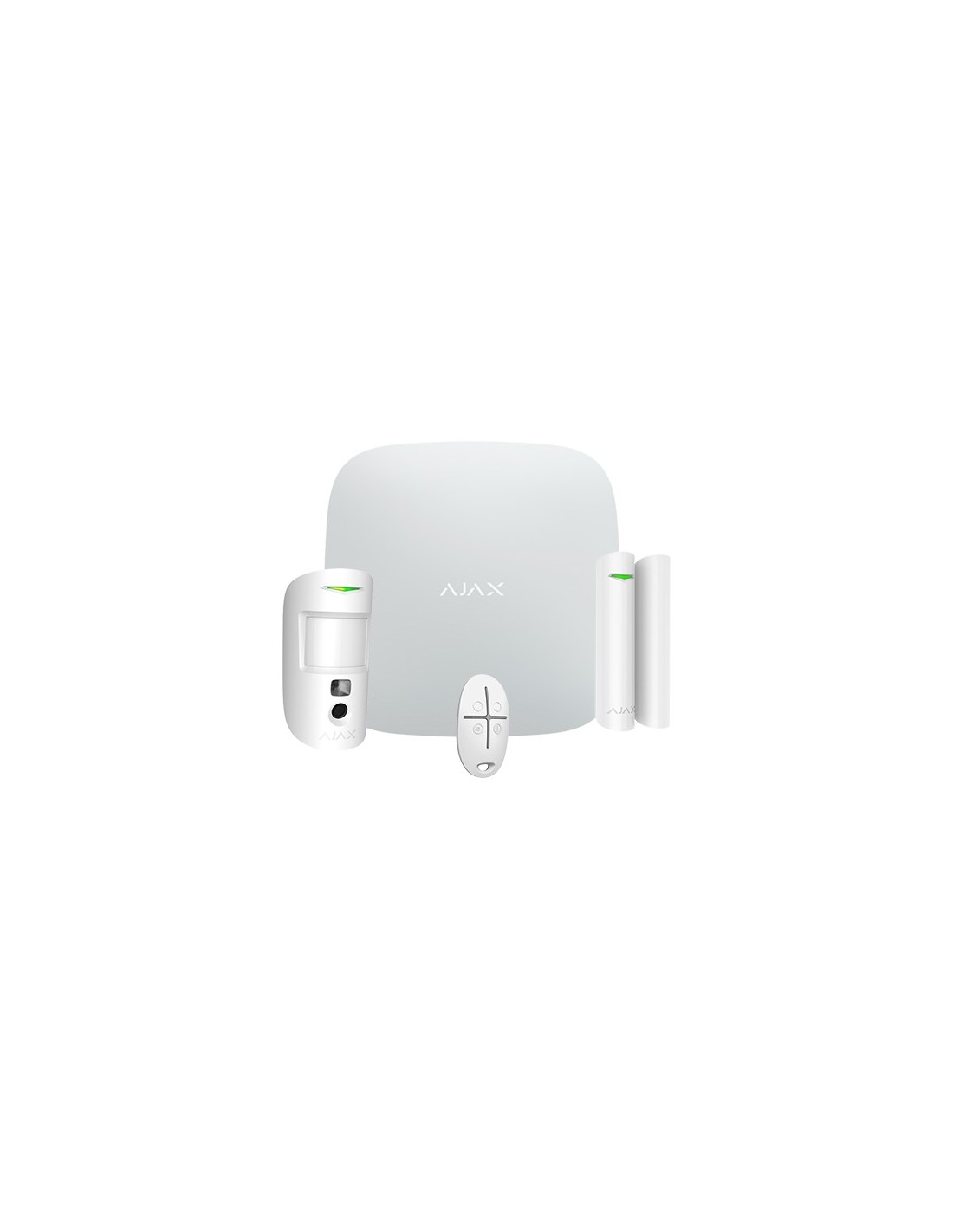 El kit incluye el panel de control AJ-HUB2PLUS-W, un fotodetector AJ-MOTIONCAM-W, un contacto magnético AJ-DOORPROTECT-W y un mando a distancia AJ-SPACECONTROL-W.