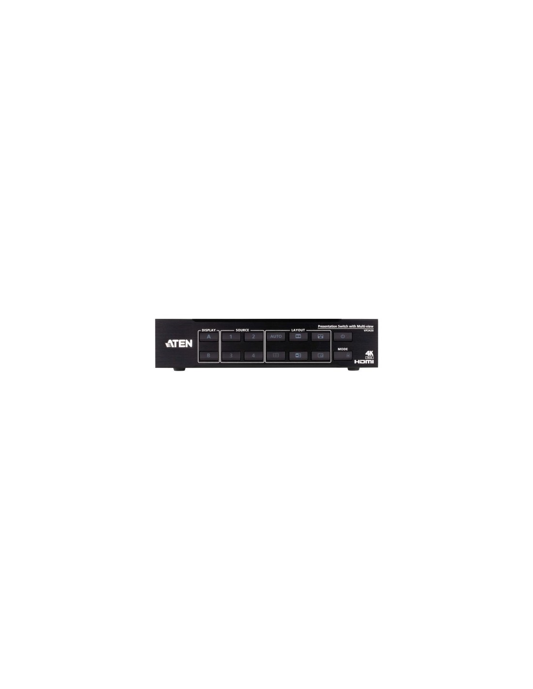ATEN VP2420. Tipo de producto: Matriz de conmutación de presentación multimedia, Máxima resolución: 4096 x 2160 Pixeles, Resolución máxima (HDMI): 4096 x 2160 Pixeles. Color de la carcasa: Negro, Material de la carcasa: Metal, Tipo de control: Botones. Consumo energético: 17,1 W. Ancho: 160,5 mm, Profundidad: 200 mm, Altura: 44 mm