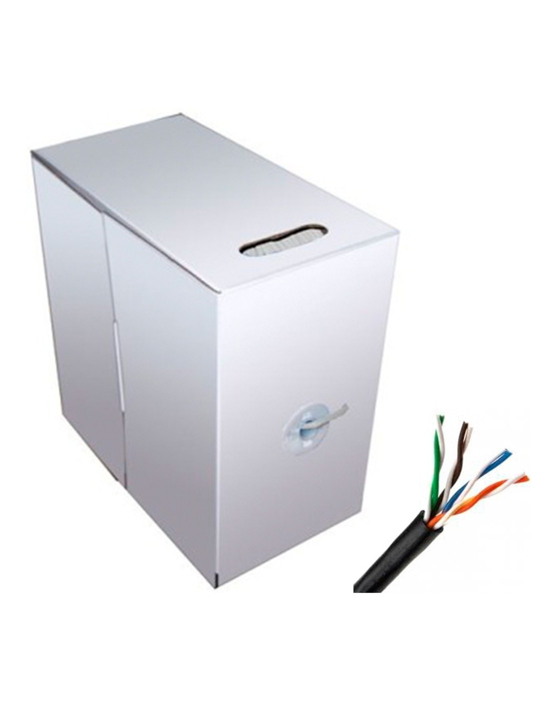 Bobina en caja | de cable | UTP Cat5e | de | 305 m | con cubierta válida para exterior | Cable UTP CAT5e rígido para | exterior CCA | Longitud 305M | Diámetro 5.5 mm | Color cubierta | negro | intemperie | Conductor 24AWG SOLID * 8C