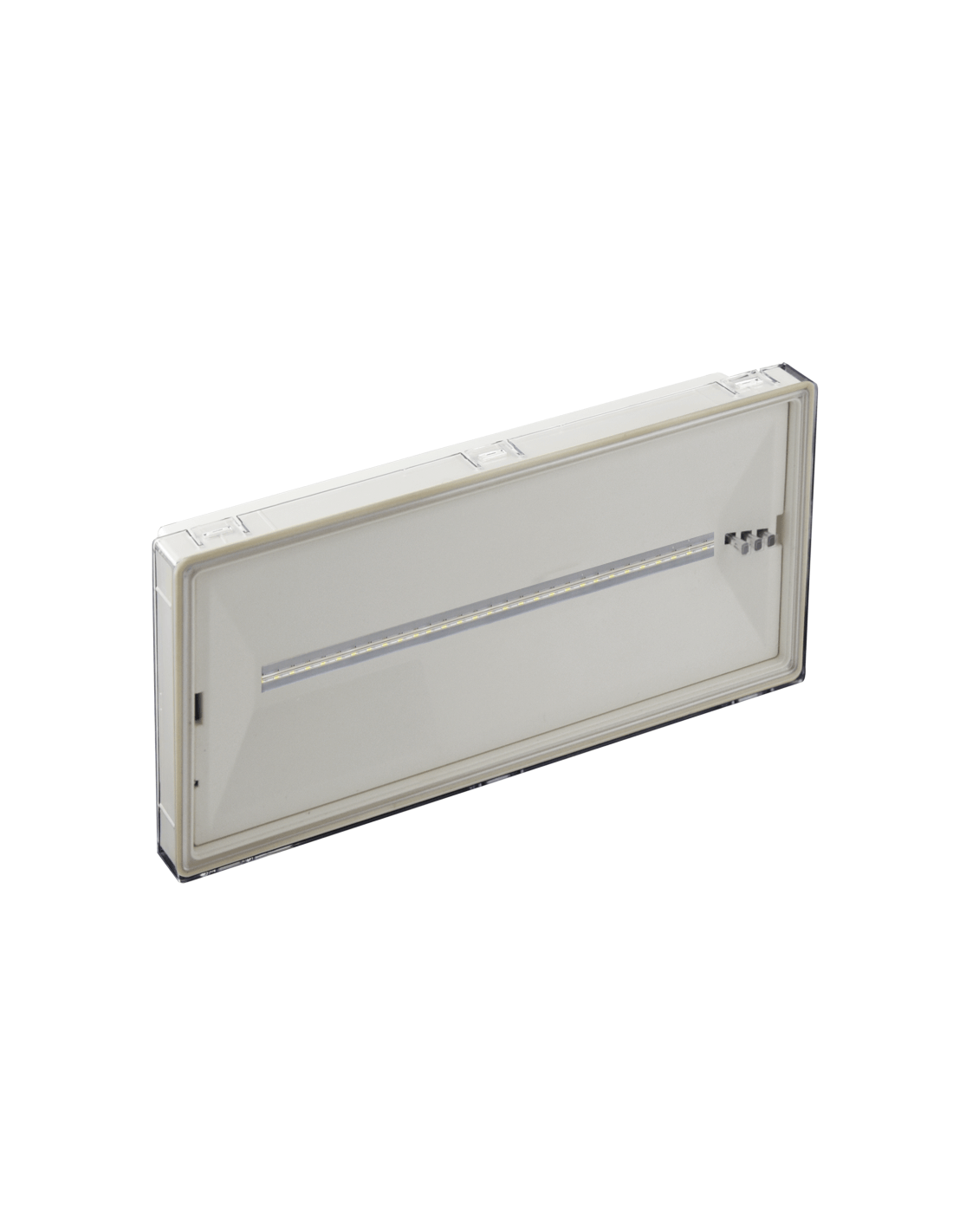Luminarias de emergencia LED blanco. 15 leds blancos 38-100 lumens | Funcionamiento mantenido/no mantenido. | Voltaje 220-240V AC / 50-60Hz. Consumo 3.4W / 3.6VA | Batería (Ni-Cd) 3.6V/1Ah. Carga 24h, Autonomía mínima 3H. IP 42 | Certificado. Distancia visión 25m | Dimensiones 270x147x48mm. Peso 620g.