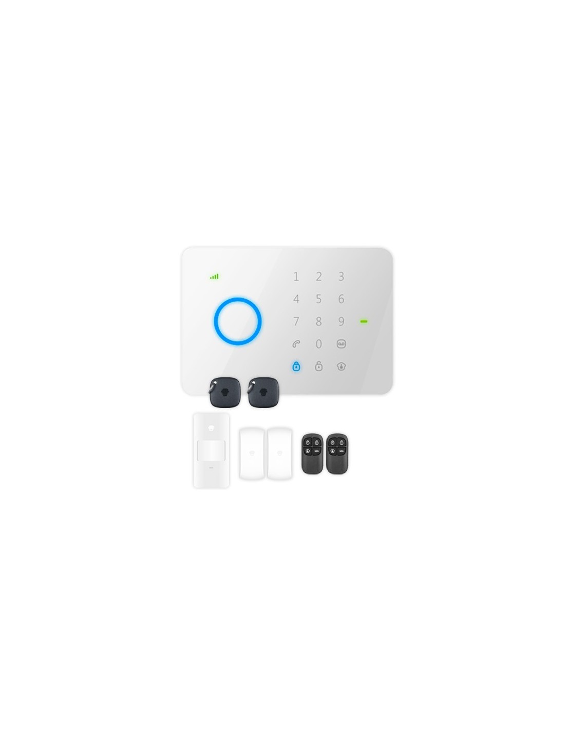Kit de alarma doméstica - Panel táctil con módulo GSM - Envío de alertas por SMS y llamada - Detector PIR volumétrico - 2 Contactos magnéticos puerta/ventana - Incluye 2 mandos y 2 tarjetas RFID
