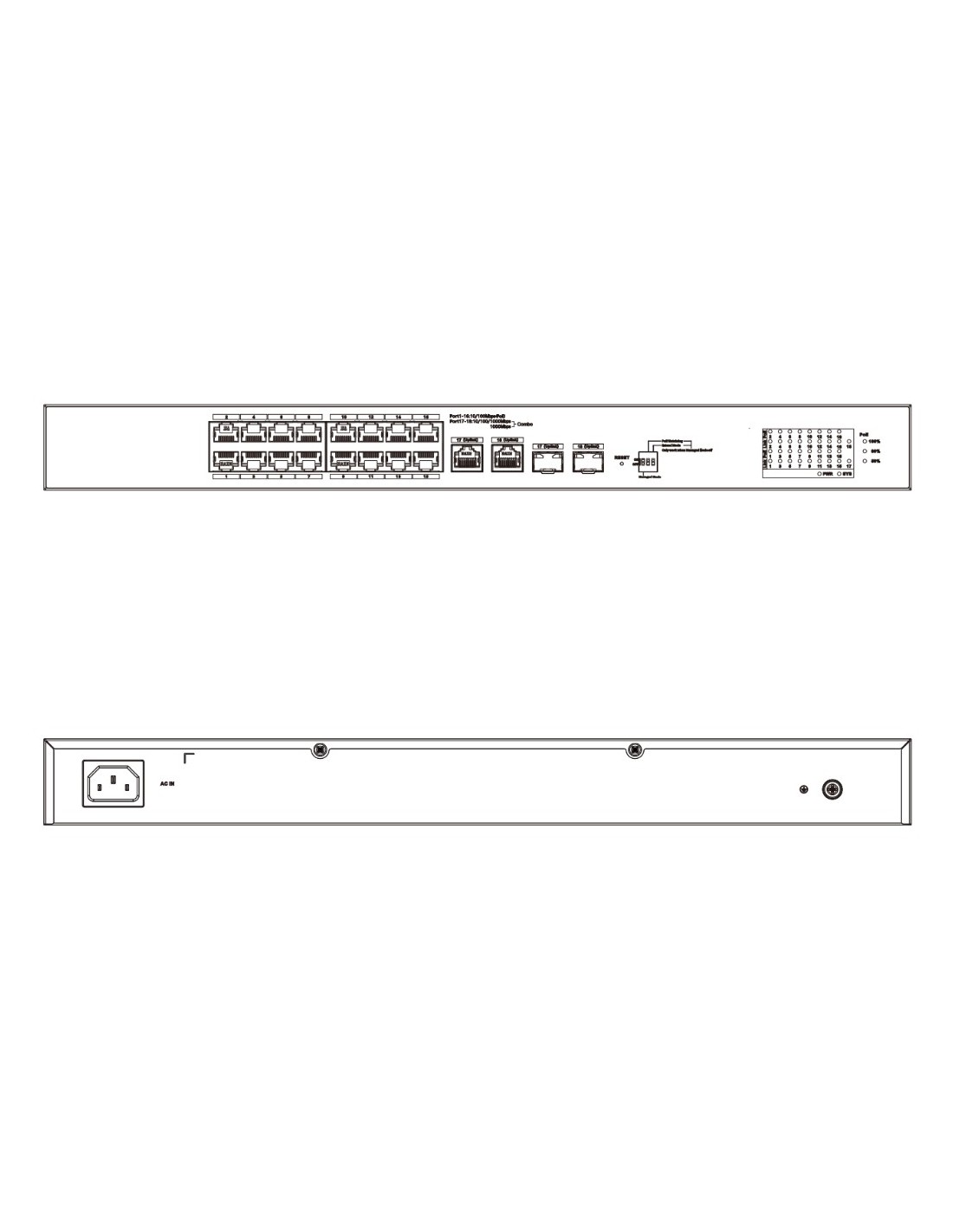 - Puertos 1-16: 16xRJ45 10/100Mbps (PoE).