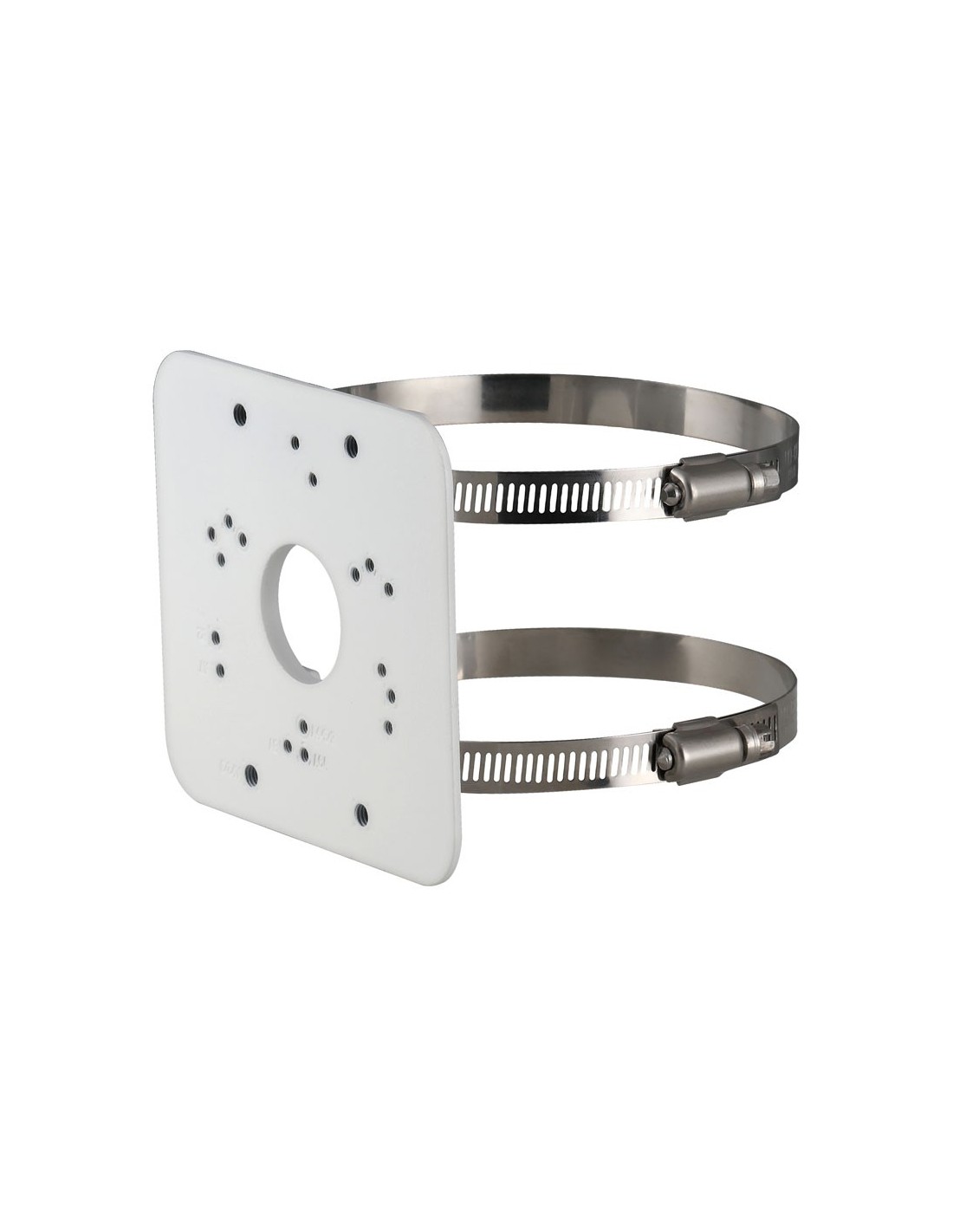 Soporte de montaje en poste. Fabricado en aleación de aluminio y acero inoxidable SUS304. Compatible con diferentes tipos de cámaras. Apto para postes de 80 a 150 mm de diámetro. Soporta hasta 3 kg de carga. Resistente a temperaturas de -40 °C a +60 °C y humedad relativa inferior al 90%