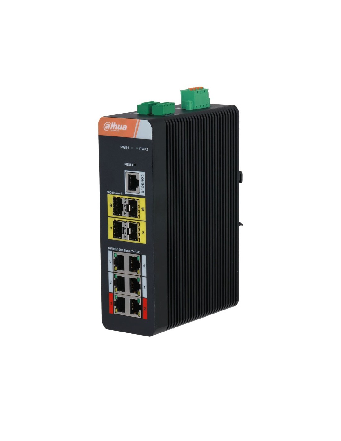 Switch Industrial Gestionable (L2) Dahua. 6 puertos PoE Gigabit. 4 puertos SFP Gigabit. 1 puerto consola. Los puertos PoE 1 y 2 admiten 90W. Entrega PoE total de 120W. Transmisión PoE de larga distancia de 250 m (10 Mbps). Gestión en la nube mediante plataforma Dolynk. Admite STP/RSTP/ERPS. Lightning-proof 4KV. 53V CC. Rail DIN