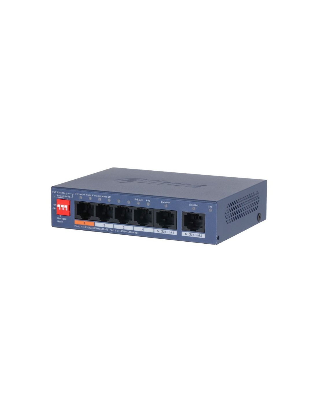Switch PoE Dahua Serie CS4000. 6 puertos Gigabit, de los cuales 4 son PoE con entrega PoE total de 60 W. Gestio?n local vía web o en la nube con DoLynk Care. Compatible con PoE 802.3af/at y Hi-PoE. Incluye PoE Watchdog, VLAN y protección contra bucles. Transmisión PoE de hasta 250 m. Diseño metálico para sobremesa o pared