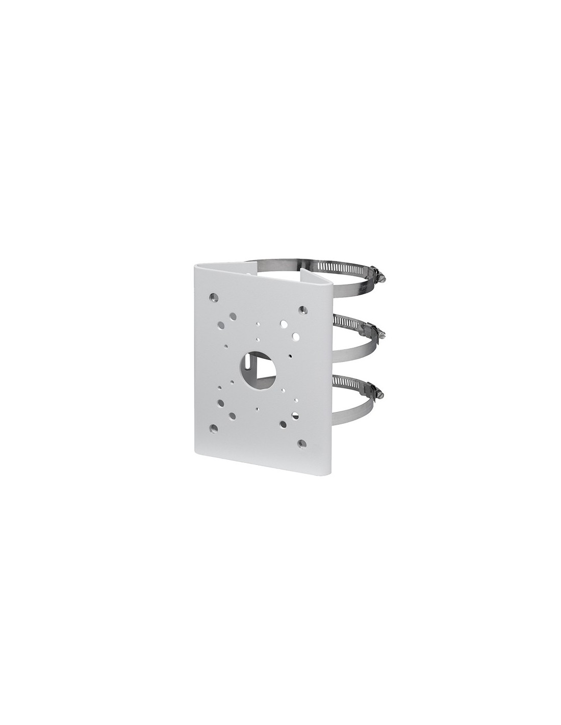 Compatible con las cámaras (Ver compatibilidad de accesorios). Queda fijado al soporte de pared de la cámara a través de 4 tornillos incluidos. Se ancla al mástil o farola a través de 3 bridas metálicas, altamente resistentes con un rango de diámetro útil de 103 ~ 127 mm. Puede instalarse en cualquier superficie cilíndrica que se encuentre entre esas dimensiones.