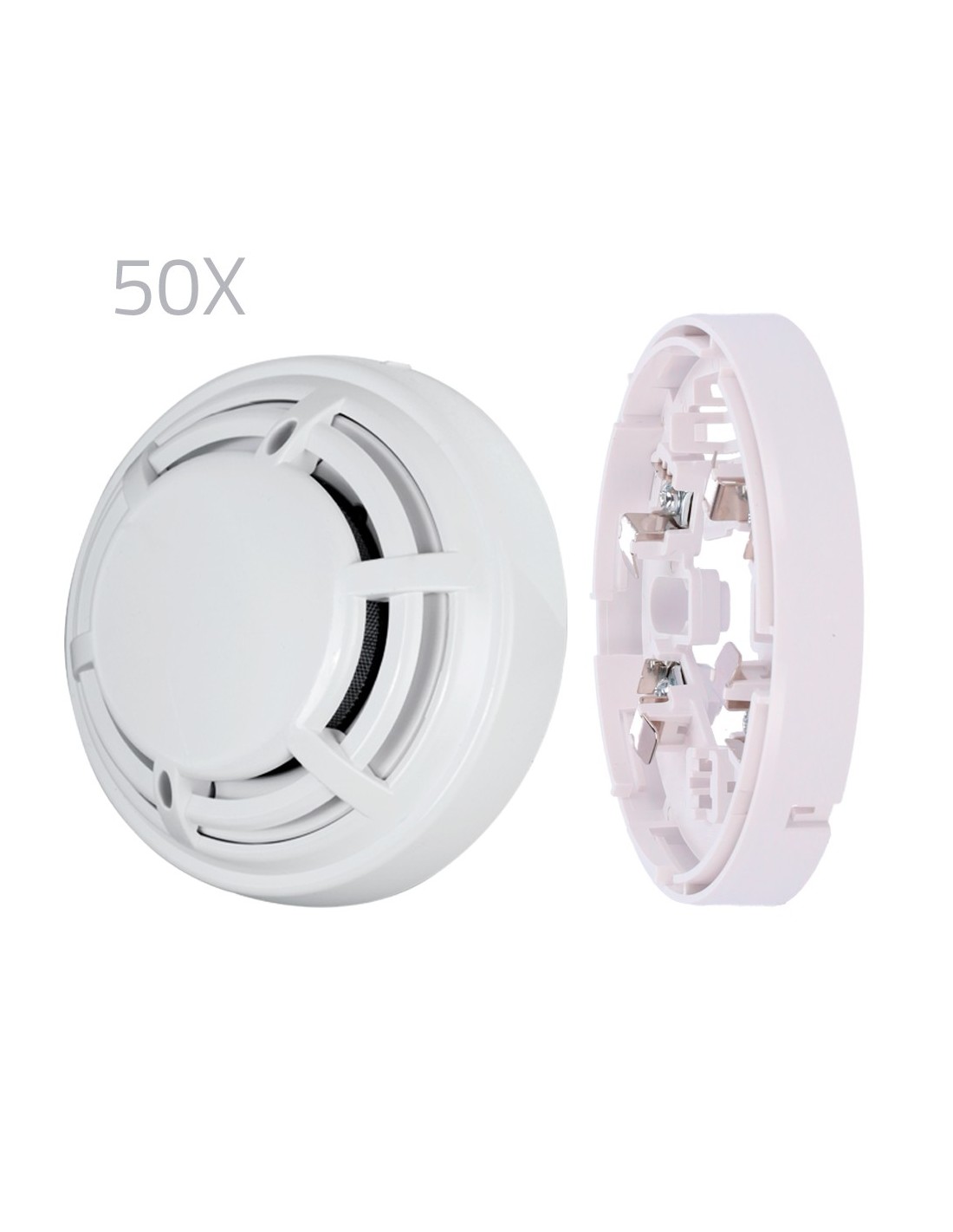 - Kit formado por 50 detectores convencional óptico de incendio y 50 bases de perfil bajo