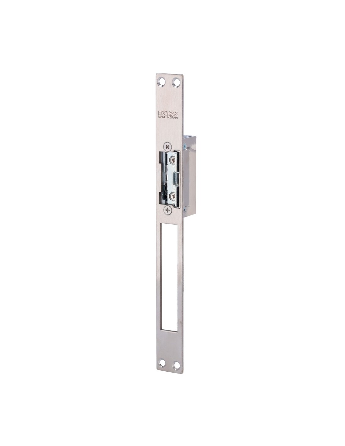 Abrepuertas eléctrico Dorcas - Para puerta sencilla | Pestillo radial regulable - Modo apertura Fail Secure (NO) - Fuerza de retención 330 kg - Alimentación AC/DC 10-24V - Hembrilla y paso libre | Instalación sin corte