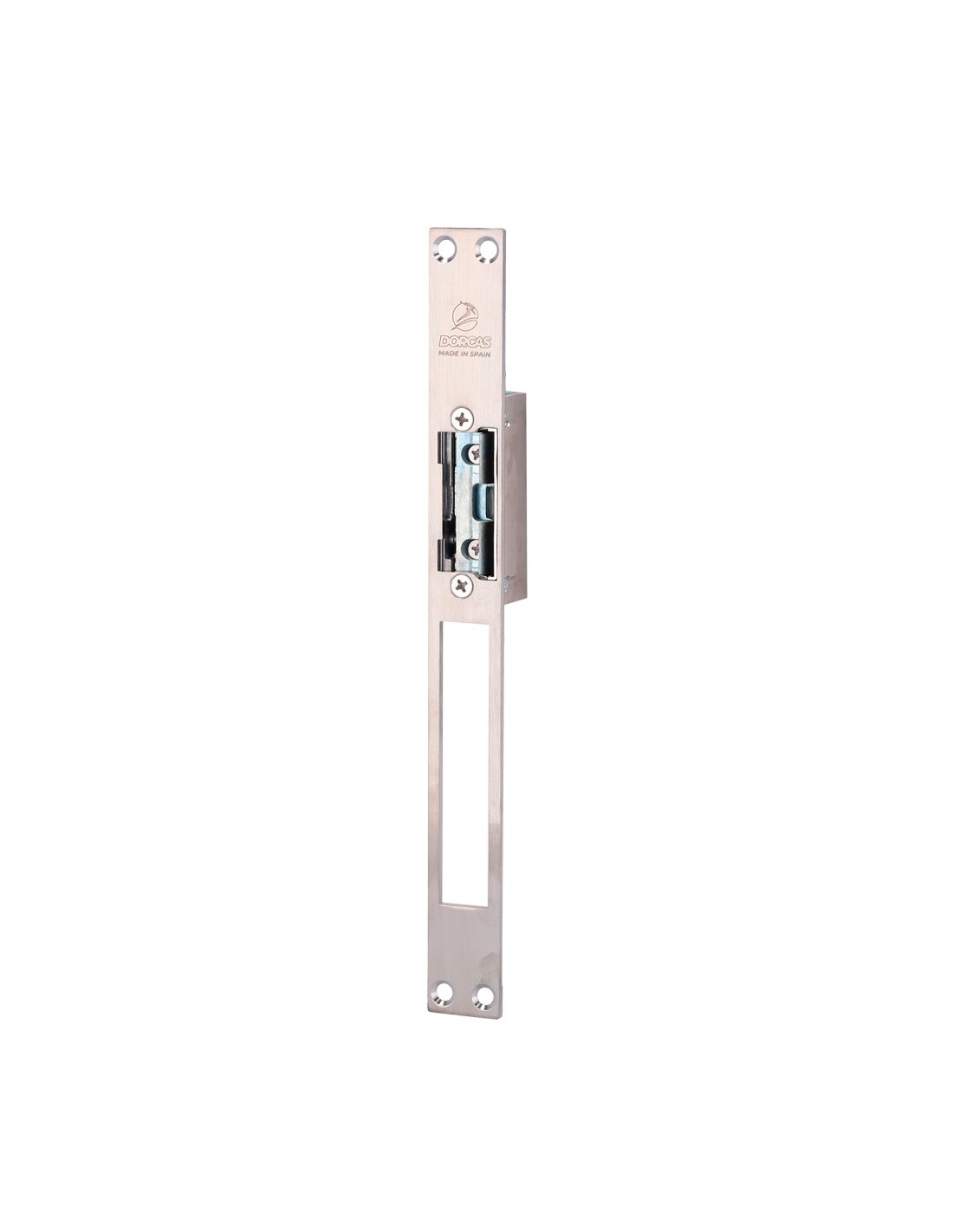 Abrepuertas eléctrico Dorcas - Para puerta sencilla | Pestillo radial regulable - Modo apertura Fail Secure (NO) - Fuerza de retención 330 kg - Alimentación AC/DC 10-24V - Hembrilla | Instalación sin corte