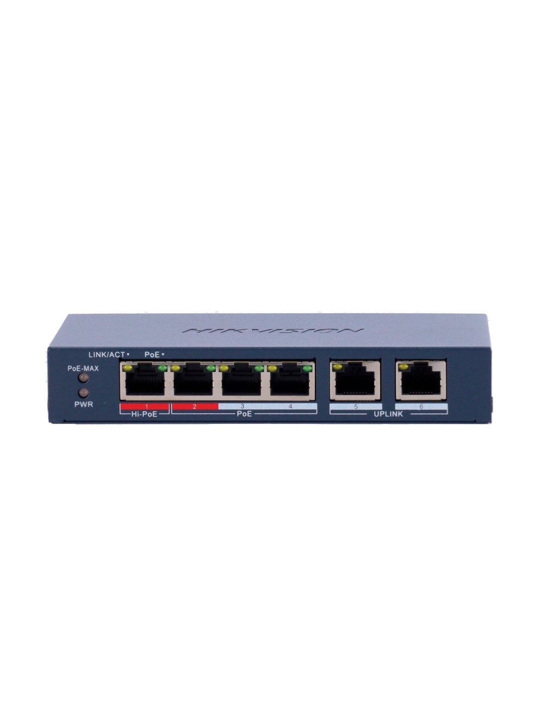 Hikvision HiPoE Switch Gestionable - 4 puertos PoE 802.3af/at + 2 Uplink RJ45 - 4 RJ45 10/100Mbps + 2 RJ45 10/100Mbps - 802.3af/at/bt / Máximo 60W - VLAN/Port Isolation/Loop Detection/LLDP - Link Aggregation/PoE Watchdog/SNMP