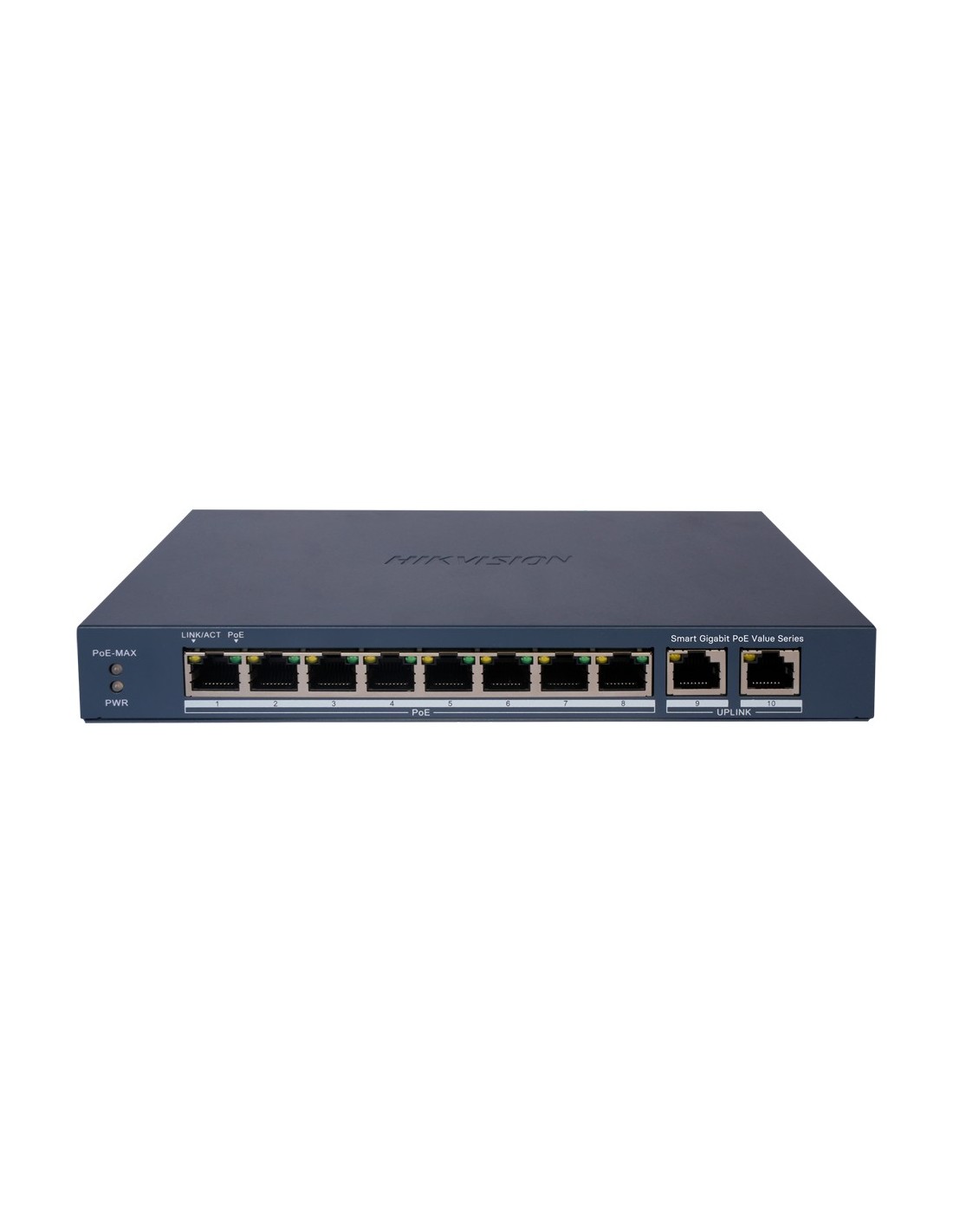 Hikvision PoE Switch Gestionable - 8 puertos PoE 802.3af/at + 2 Uplink RJ45 - 8 RJ45 10/100/1000 Mbps + 2 RJ45 10/100/1000Mbps - 802.3af/at / Máximo 60W - VLAN/Port Isolation/Loop Detection/LLDP - Link Aggregation/PoE Watchdog/SNMP