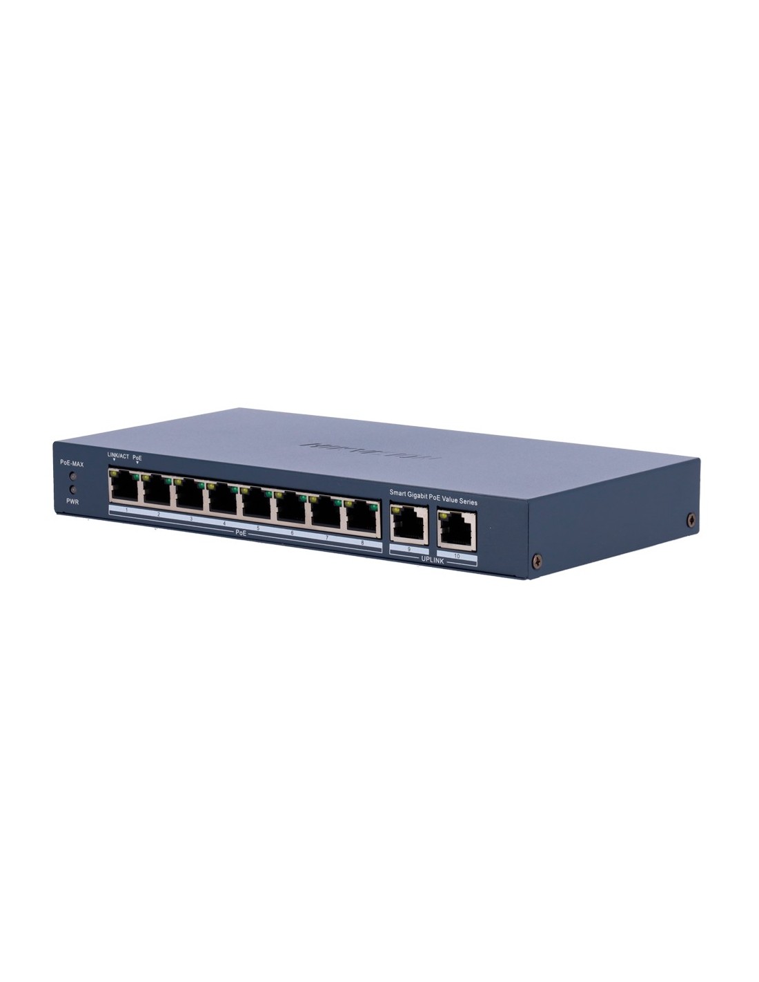 Hikvision PoE Switch Gestionable - 8 puertos PoE 802.3af/at + 2 Uplink RJ45 - 8 RJ45 10/100/1000 Mbps + 2 RJ45 10/100/1000Mbps - 802.3af/at / Máximo 60W - VLAN/Port Isolation/Loop Detection/LLDP - Link Aggregation/PoE Watchdog/SNMP