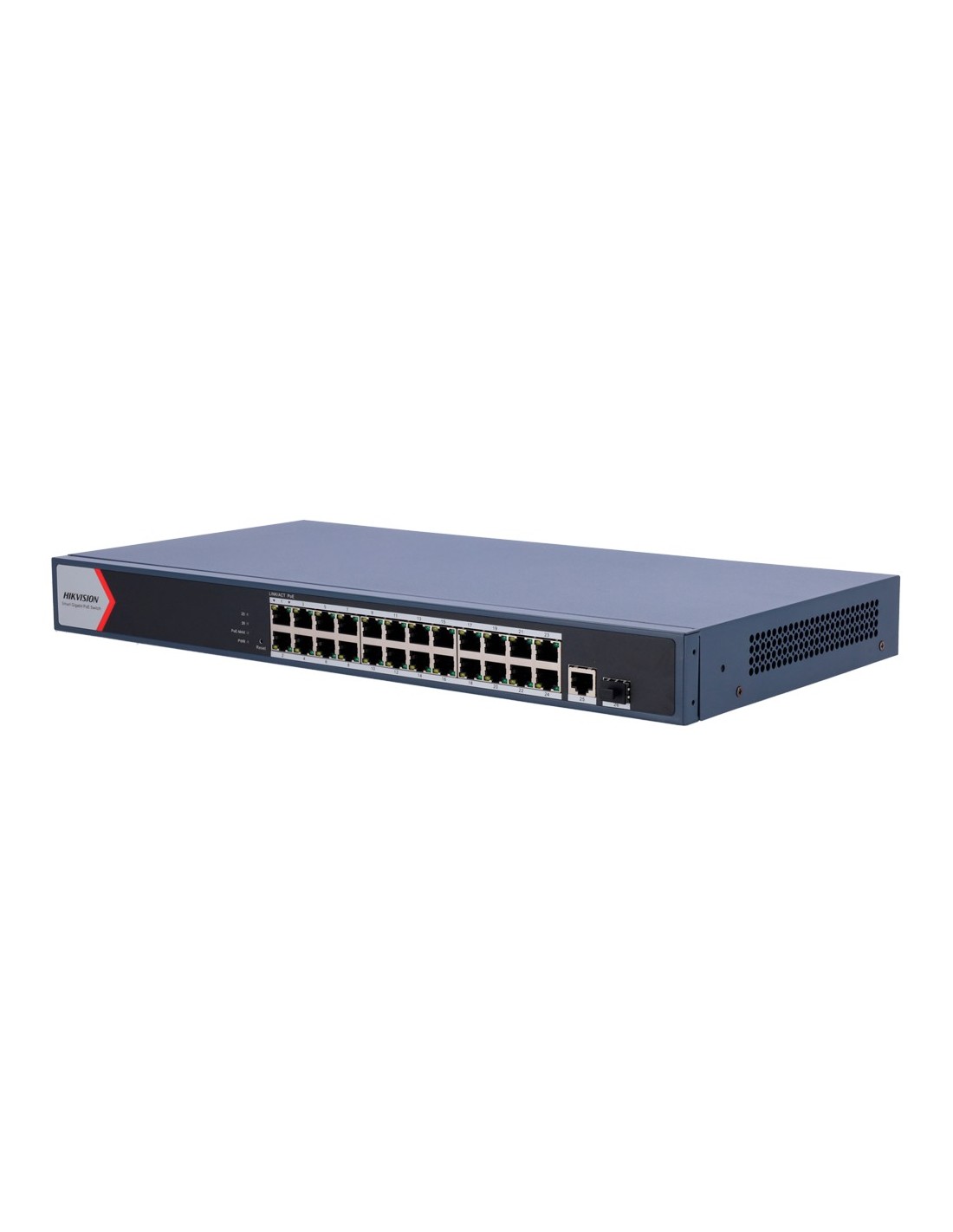 Switch PoE Hikvision - 24 puertos RJ45 GE + 1 puerto Gigabit RJ45/SFP - 24 Puertos PoE+ 802.3af/at - Hasta 370w de Potencia PoE Total - PoE Extendido / PoE Watchdog / Port Isolation - Instalación en rack/pared/sobremesa