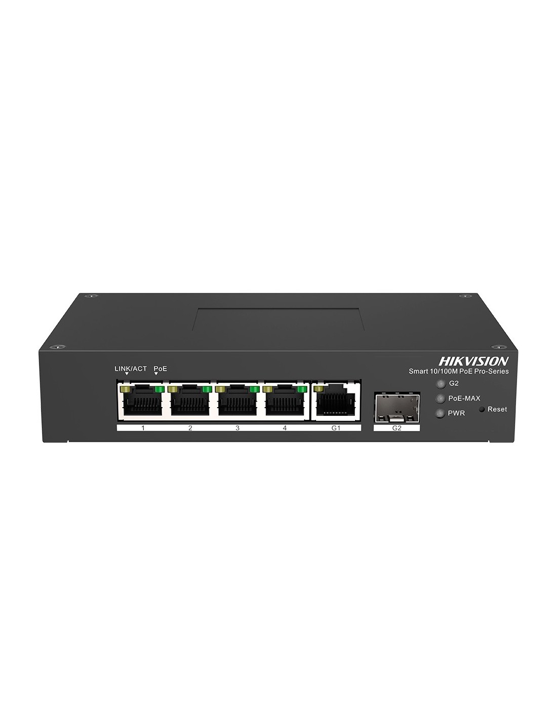 Switch PoE Hikvision - 4 puertos RJ45 FE + 1 puerto Gigabit RJ45/SFP - 4 Puertos PoE+ 802.3af/at - Hasta 60w de Potencia PoE Total - PoE Extendido / PoE Watchdog / Port Isolation - Instalación en pared/sobremesa