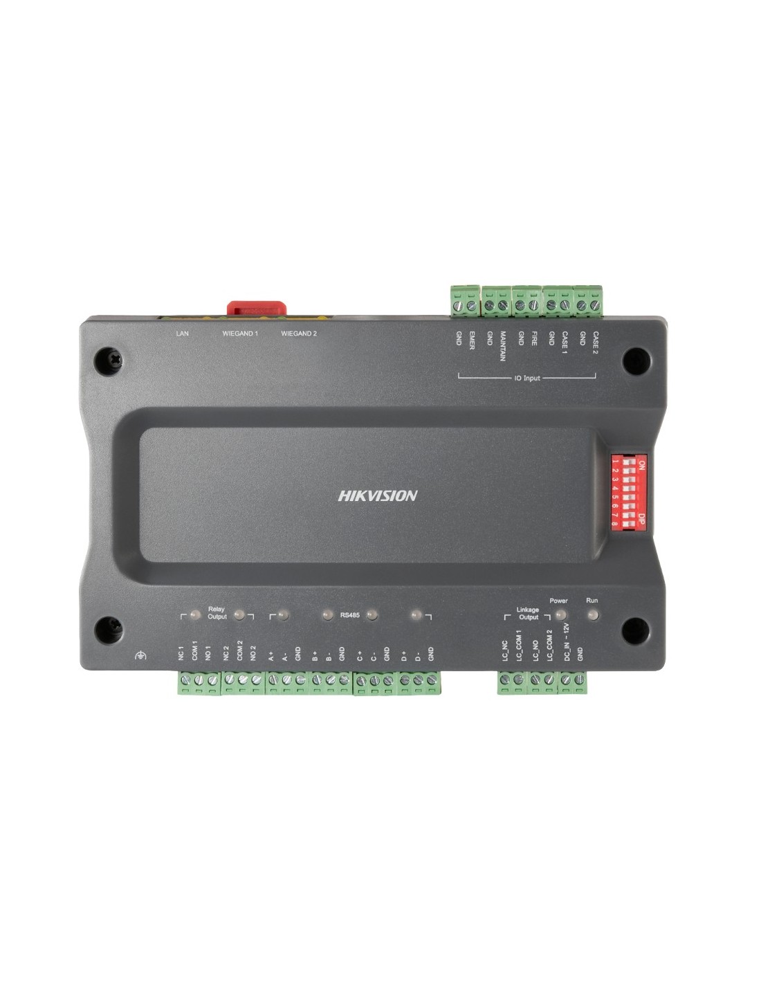 Controladora maestra para ascensores - Acceso por huella, facial, tarjeta o contraseña - Comunicación TCP/IP - 2 entradas Wiegand 26 y 2 RS485 - Salida de 2 relés - Software iVMS-4200
