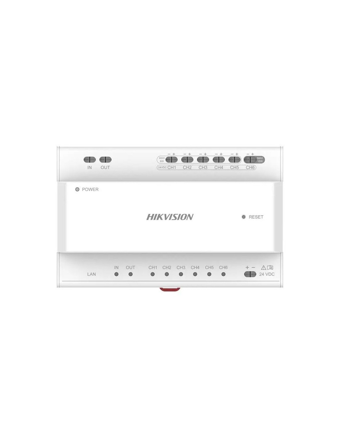 Distribuidor IP de 2 hilos HIKVISION. 6 interfaces en cascada de 2 hilos con alimentación de dispositivos. 2 interfaces para conexión en cascada. 8 indicadores de interfaz. 1 interfaz RJ45, 1 botón de reinicio. Montaje en carril DIN, 24VDC