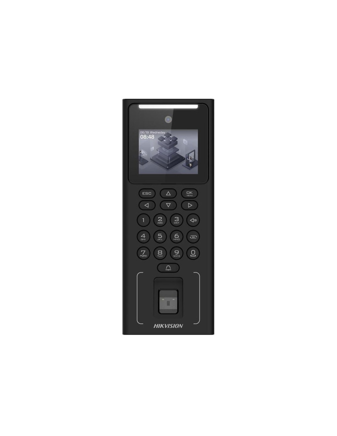 Terminal de control de accesos HIKVISION. Pantalla LCD de 2,4". Cámara de 2MP. Lector Mifare 1. Capacidad para 500 rostros, 3000 huellas y 3000 tarjetas. Registro de 150 000 eventos. Múltiples métodos de autenticación: facial, huella dactilar, tarjeta, PIN, etc. Interfaz RJ45, USB. Tamper antisabotaje. Soporta protocolos ISAPI e ISUP 5.0. Configuración a través del cliente web