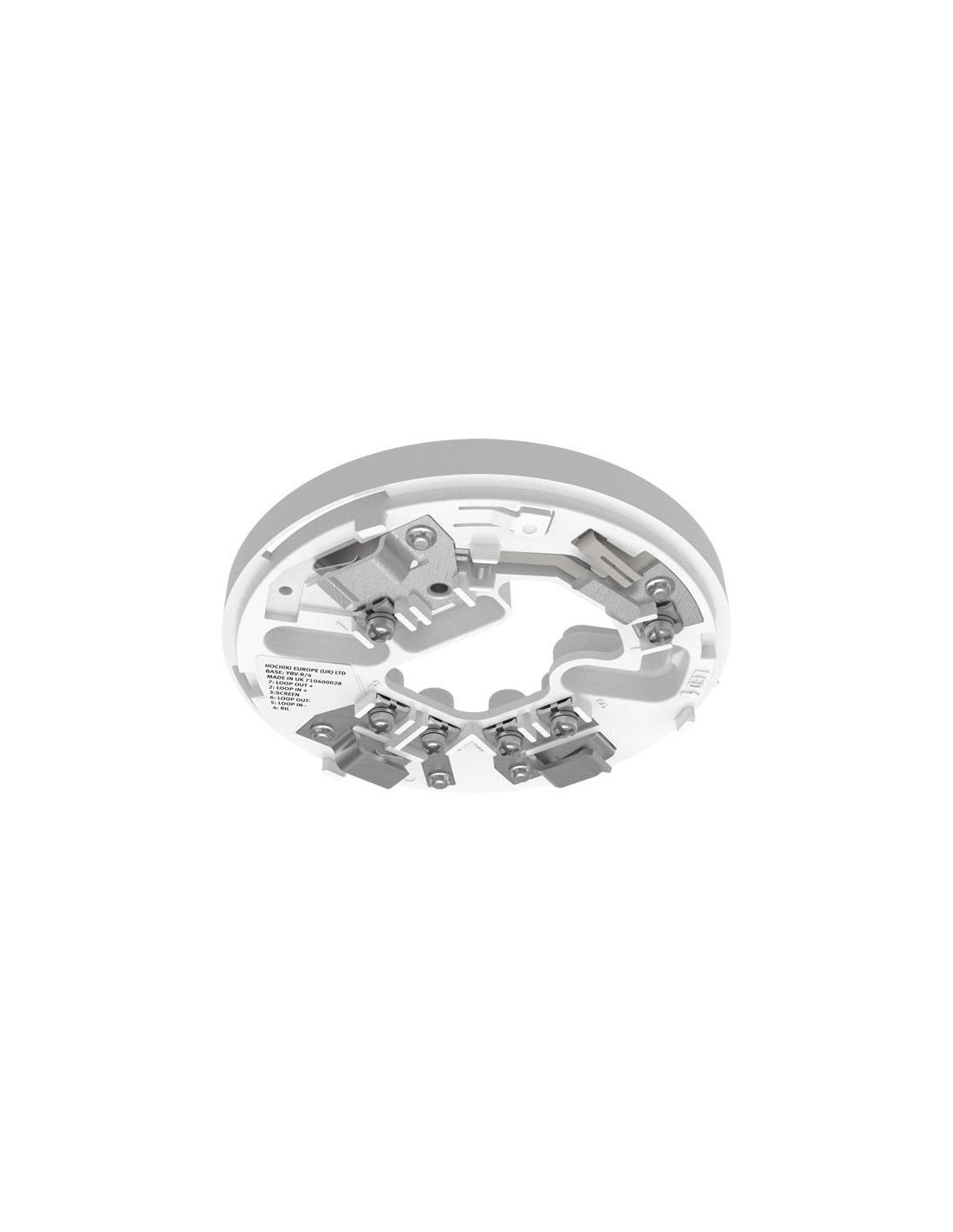 Base de montaje para detectores Hochiki SCI. Libre de electrónica. Contactos de acero inoxidable. Toma cables de 2,5 mm2. Perfil delgado: solo 8 mm. Facilidad para indicador remoto. Conexión rápida mediante abrazaderas de cable cuadradas. Color blanco