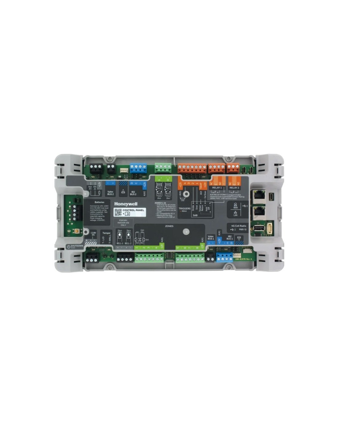 PCB de central MaxPro de 8+2 zonas en placa. Ampliable a 60 zonas. Intrusión y Control de Accesos integrados en la nube. 10 particiones, 500 usuarios, 30 diagramas. 4 salidas de relé. Conexión Ethernet nativa. 1 línea bus IB2 y 1 linea V-Plex. Grado 3