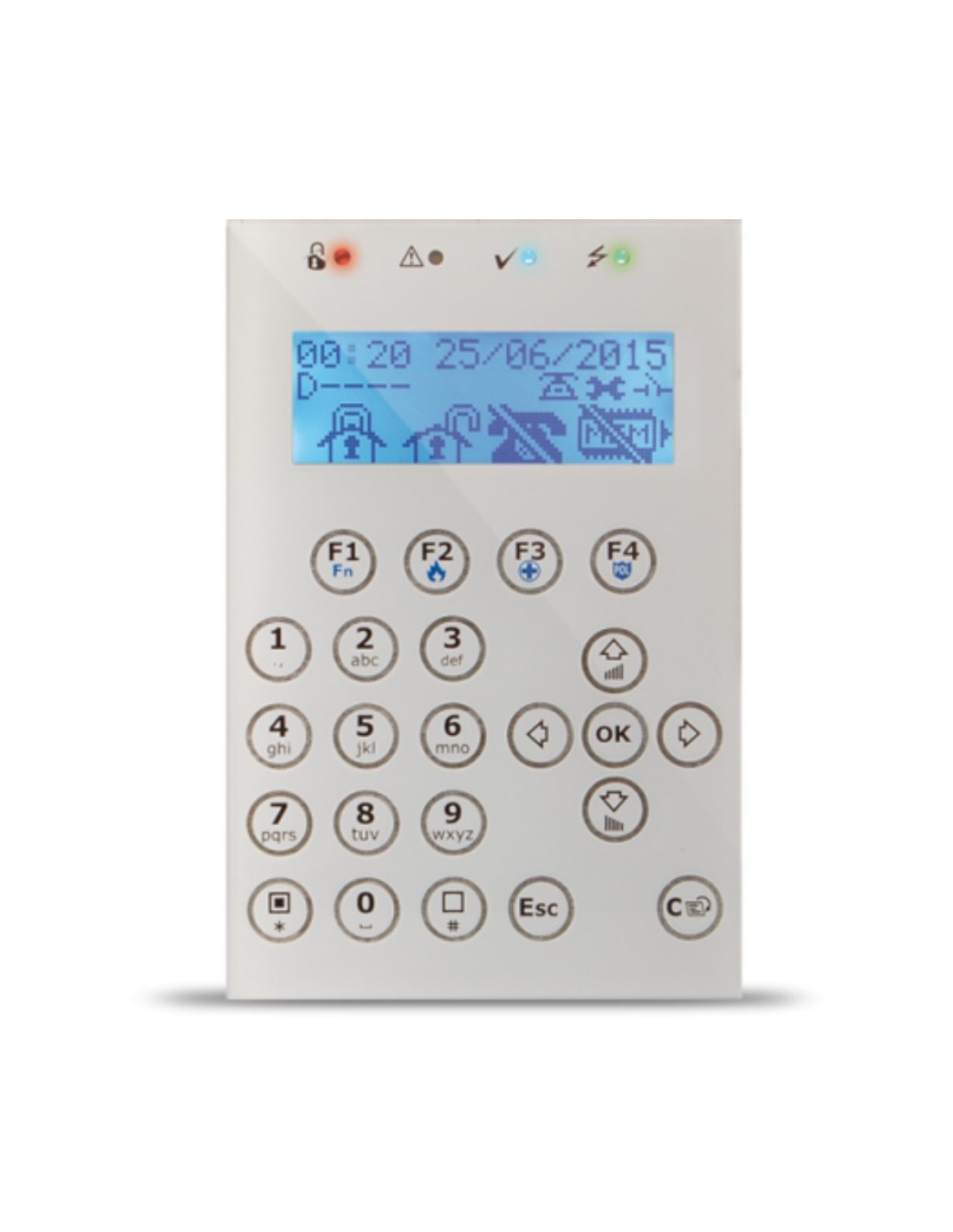 Teclado LCD. 4 leds de señalización. 1 terminal I/O. Color Blanco. Grado 3