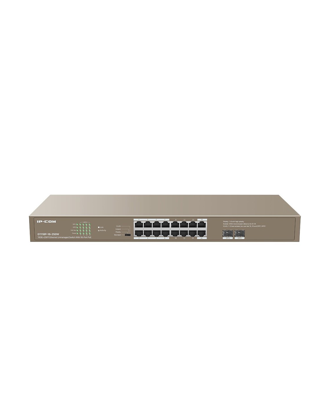 IPCOM IPCOM-38 G1118P-16-250W Switch 18 puertos no gestionado L2 16 Gigabit PoE + 2SFP Enracable 1U