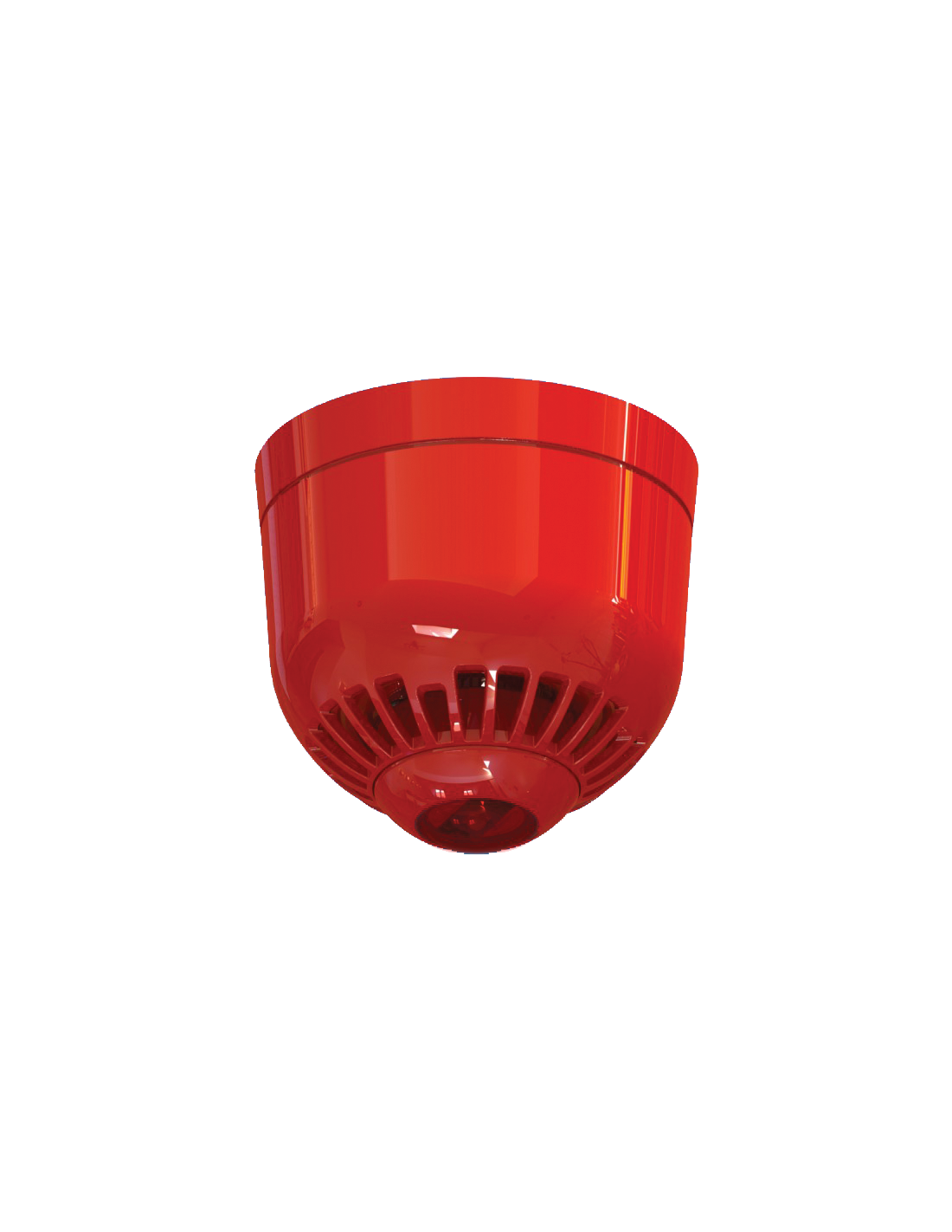 Sirena policarbonato interior con baliza para montar en techo. Roja | Lámpara lanzadestellos rojo. Sonido (Pulse Alert) 85 a 97dB | 32 tonos. Sincronización automática | Control volumen, flash ajustable. Mecanismo bloqueo anti-manipulación | Base bajo perfil con cableado a la base (TimeSaver). Sirena, baliza y control separados | Alimentación 17 a 60 VCC. Consumo sonido 5,1 mA / Luz 20 mA a 0,5 Hz 40 mA a 1 Hz