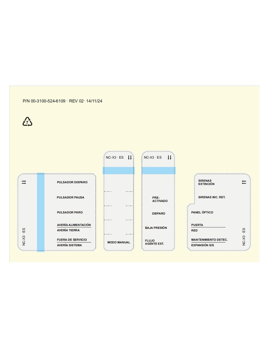 Kit Plantilla de idiomas - Portugués para Panel de incendios convencional y extinción - 3 zonas | Dimensiones: 219 x 18 x 301 mm | Compatible NC-PX3 | Peso 261 g | Vinilo troquelado | Idioma Portugués