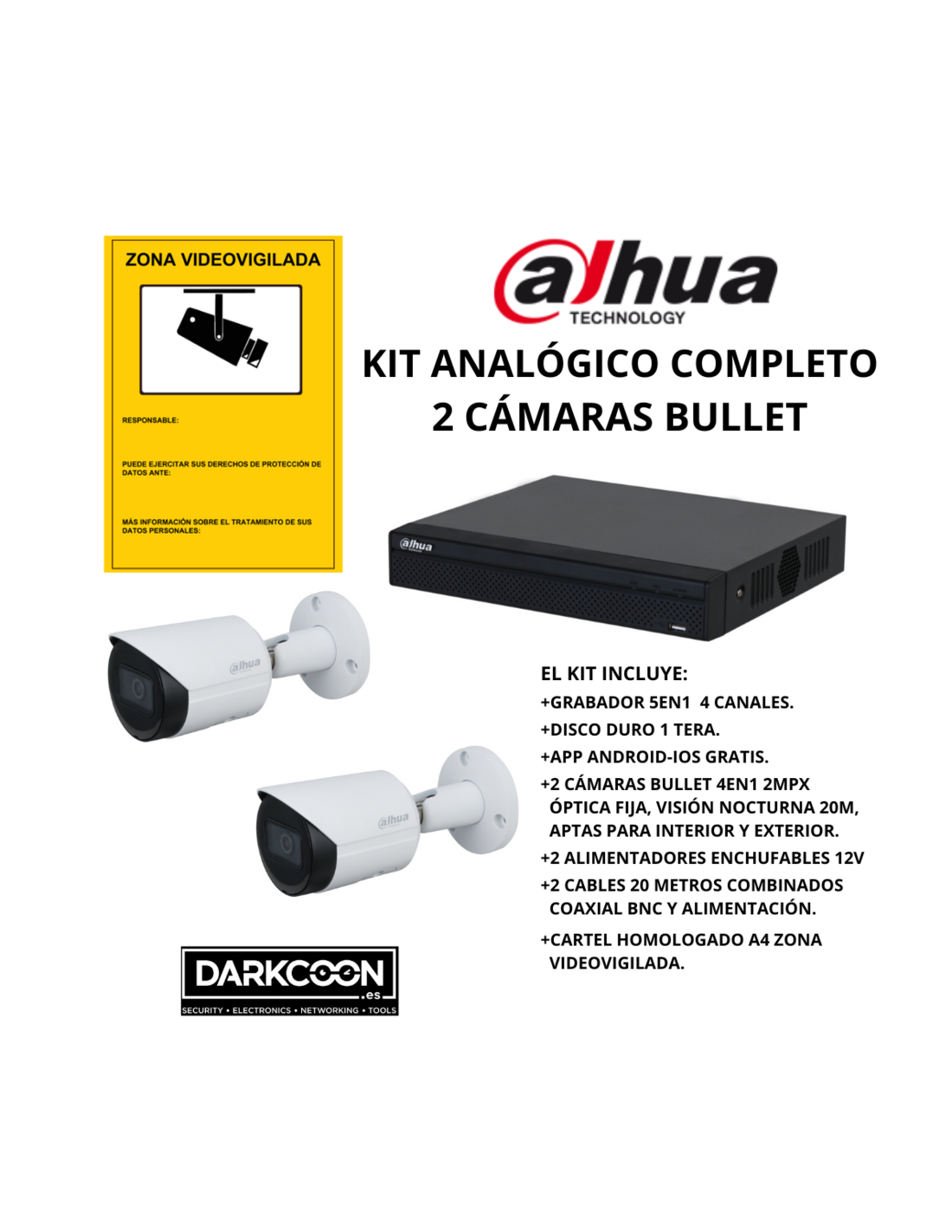 KIT-DAHUA-ANALOG-2BULLET KIT 2 CÁMARAS BULLET DAHUA ANALÓGICO. SISTEMA COMPLETO VIDEOVIGILANCIA CCTV TIENDA, HOGAR O EMPRESA.
