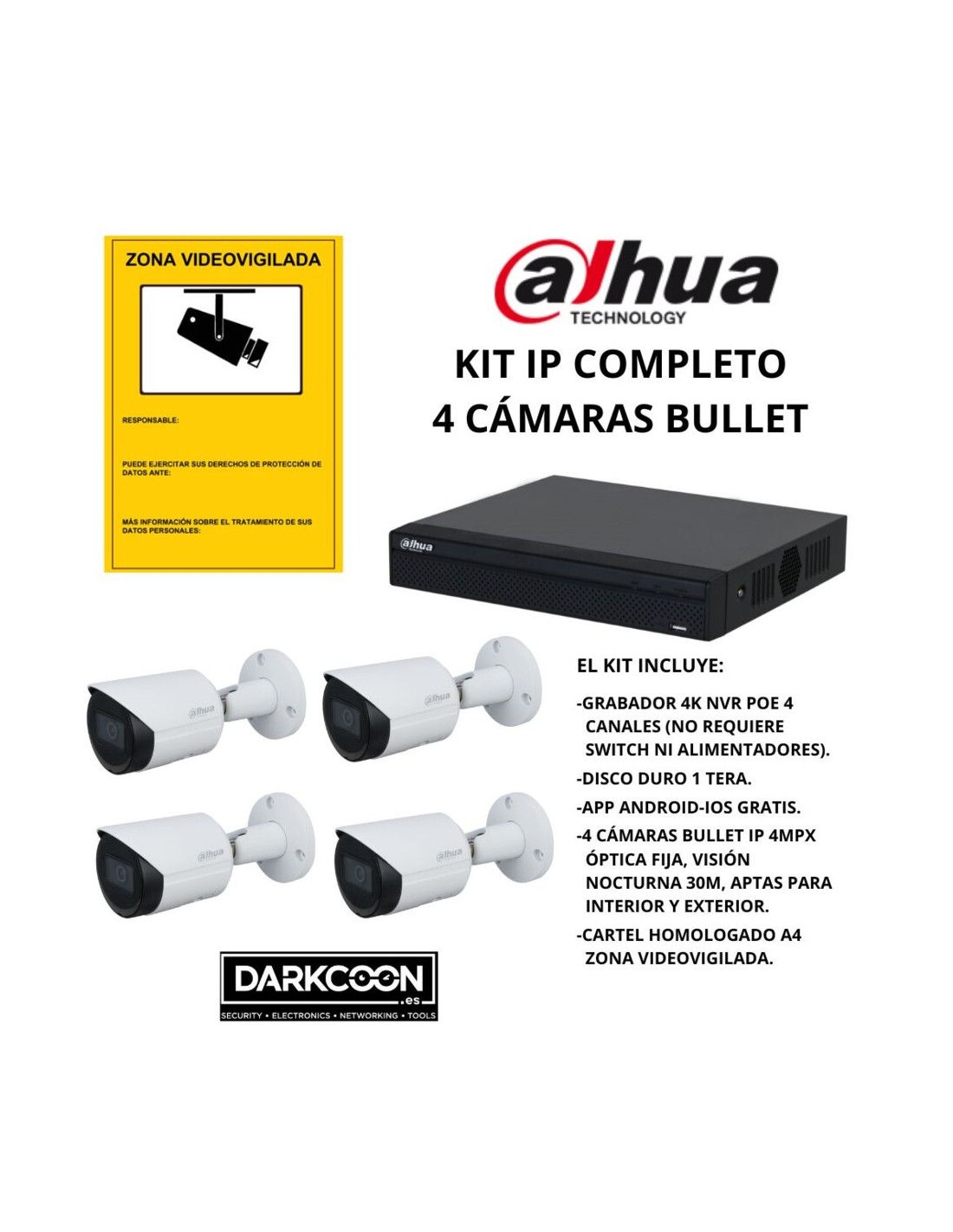 KIT 4 CÁMARAS BULLET DAHUA IP POE ONVIF. SISTEMA COMPLETO VIDEOVIGILANCIA CCTV. SEGURIDAD PARA TIENDA, HOGAR, NEGOCIO O EMPRESA.