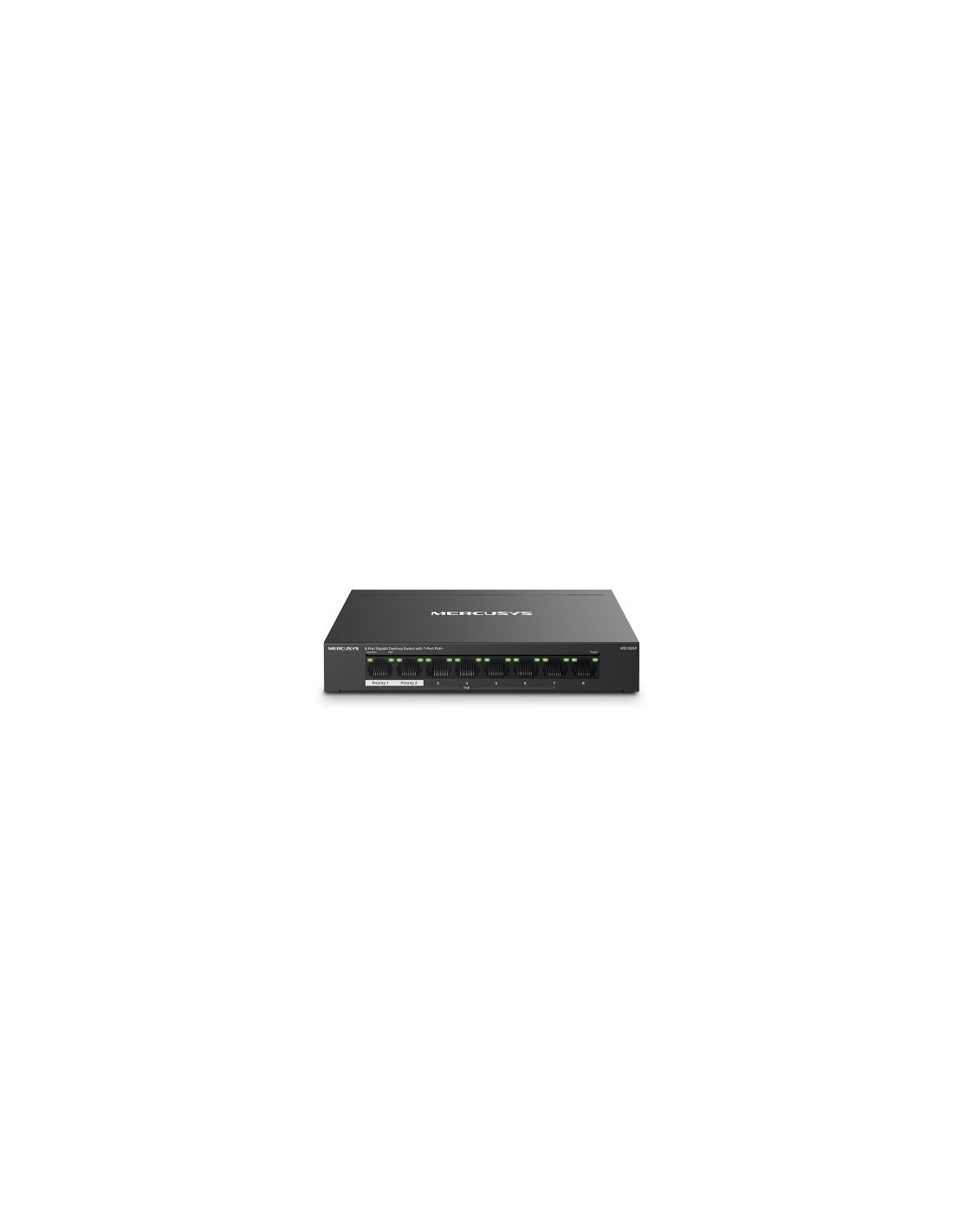 Mercusys MS108GP. Tipo de interruptor: Gestionado. Puertos tipo básico de conmutación RJ-45 Ethernet: Gigabit Ethernet (10/100/1000), Cantidad de puertos básicos de conmutación RJ-45 Ethernet: 8. Bidireccional completo (Full duplex). Tabla de direcciones MAC: 8000 entradas. Estándares de red: IEEE 802.3af, IEEE 802.3at, IEEE 802.3x. Energía sobre Ethernet (PoE). Montaje de pared