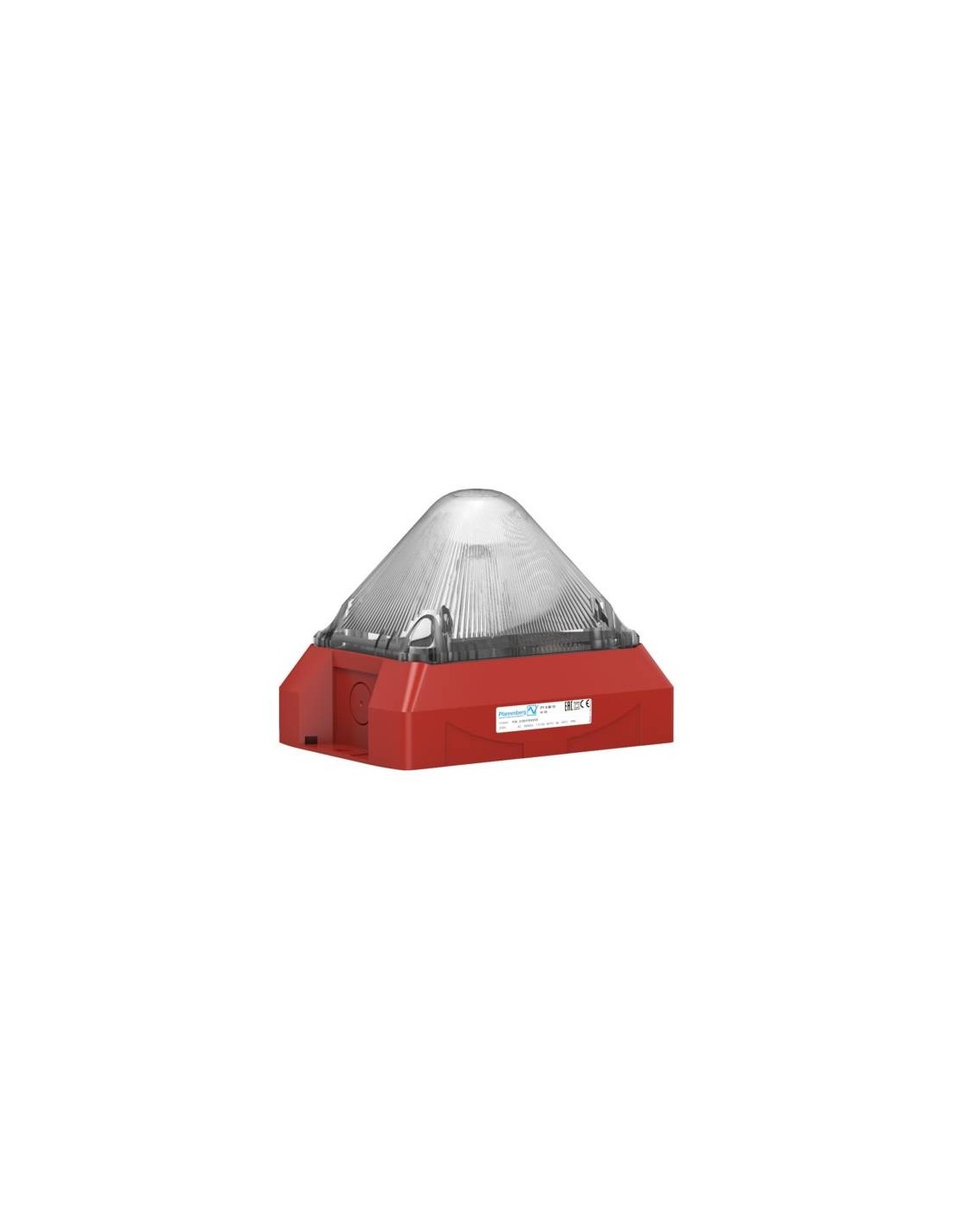 Luz de flash compacta de 5 julios, 24V CC, IP66, sincronizable. Cuerpo piramidal rojo y lente transparente. EN54-23.