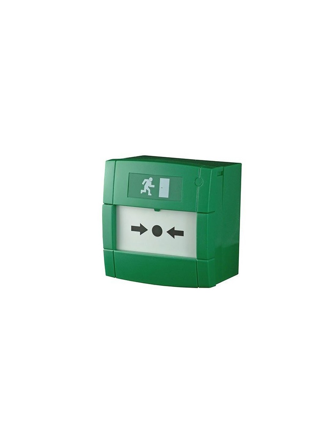 Pulsador de salida de emergencia. Color verde. Disparador flexible. Contacto unipolar. Montaje en superficie