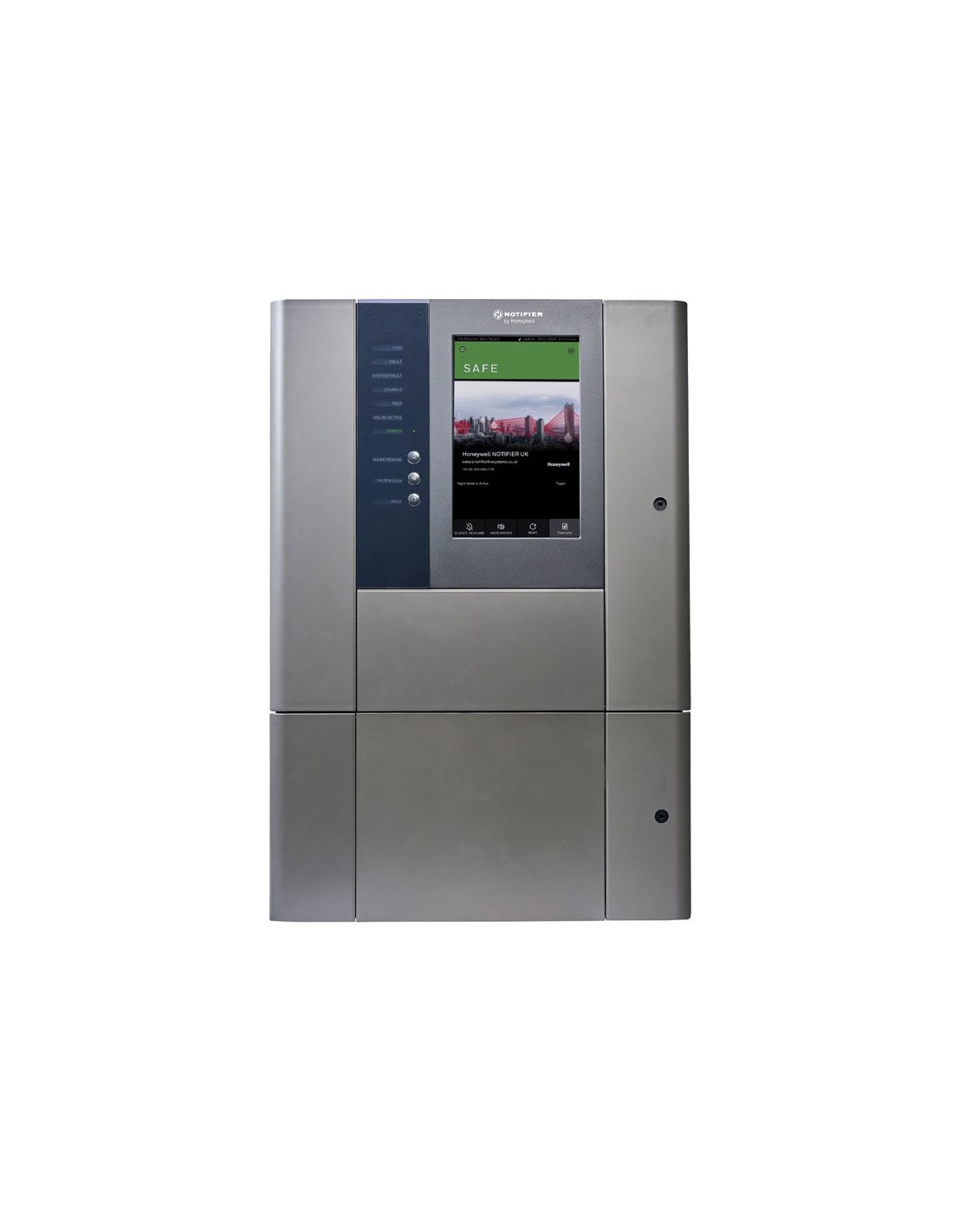 Central Notifier INSPIRE E15 con 12 ranuras para módulos. Incluye módulo de 2 lazos, módulo CPU y módulo cargador. Puerta con pantalla táctil de 10"". Fuente de alimentación de 480W. Caja trasera E15. EN54-2, EN54-4, EN 54-13
