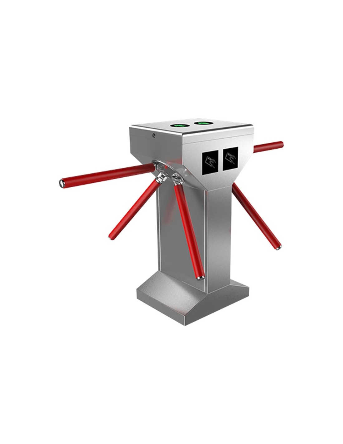 Torniquete vertical semi-automático de dos pasos. Alto tráfico: 25-48 personas/min. Entrada individual por señal o botón. Modo Antirretorno. Control electrónico de direcciones. Bloqueo magnético selectivo. En caso de emergencia el brazo cae permitiendo el paso libre. Integración con lectores de terceros. Protección IP54, acero SUS304