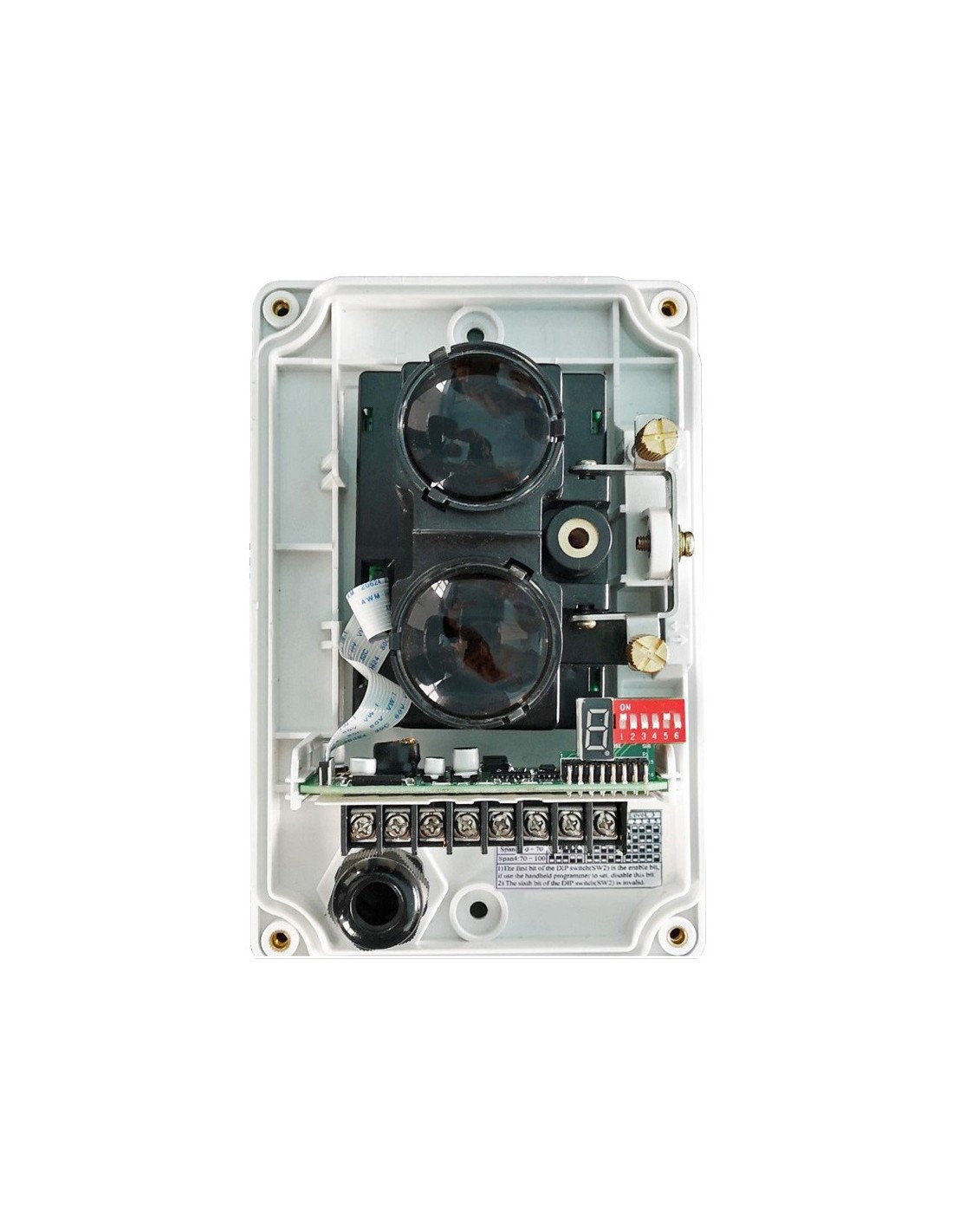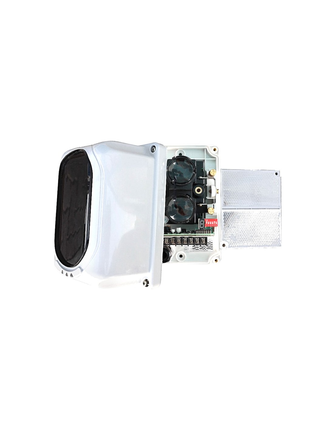 Además, cuenta con un puntero láser integrado y un display digital, lo que facilita el alineamiento preciso del espejo y el detector, y permite ajustar la intensidad de luz entre ambos, asegurando una alineación más sencilla. El dispositivo ofrece cuatro rangos de operación ajustables (8-20m, 20-40m, 40-70m y 70-100m) y tres niveles de sensibilidad (2.6dB, 3.8dB y 5.8dB).