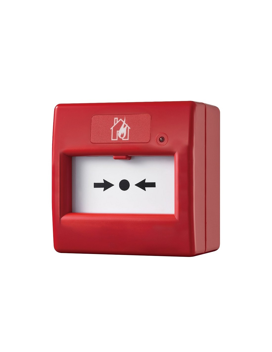 Pulsador de llamada manual reiniciable en color rojo. LED rojo con resistencia de limitación de corriente. Cubierta protectora no incluida. Certificado EN54.