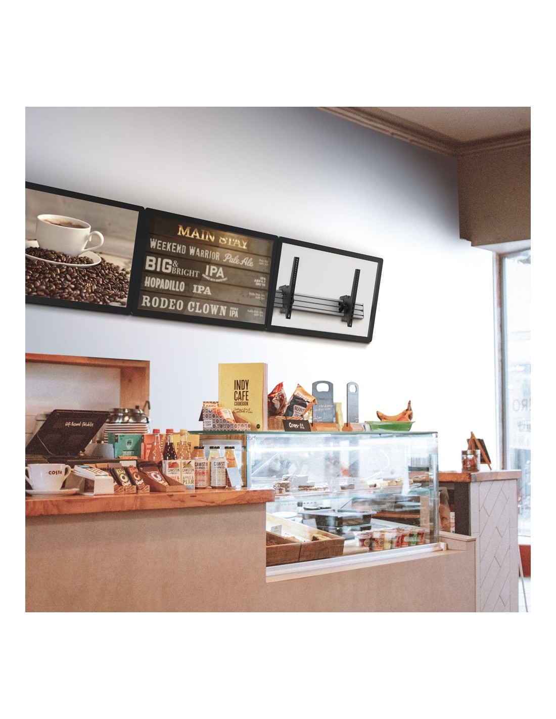 Soporte Menuboard - Peso soportado 50 Kg/monitor - VESA 600x400 mm/monitor - Inclinación 0º ~ -20º - Distancia a la pared 100 mm - Disposición 3x1