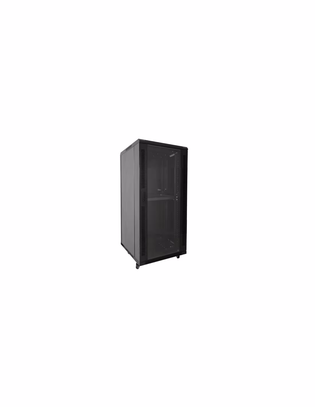 Este armario rack de 19" y 18U está diseñado para instalación en suelo y ofrece una capacidad de carga de hasta 800 kg, lo que lo hace ideal para alojar servidores, electrónica de red y equipos de comunicaciones en entornos profesionales exigentes. Dispone de grado de protección IP20, puerta delantera de cristal con cerradura para control de acceso, paneles laterales desmontables y zonas inferior y frontal ventiladas que facilitan la refrigeración natural del interior. Incorpora de serie una regleta de 6 tomas, 2 ventiladores ya integrados y 2 bandejas para la colocación de equipos, además de múltiples entradas para el cableado que simplifican la organización y el guiado de los patch cords. Está fabricado en acero SPCC de alta resistencia, acabado en color negro, y se suministra desmontado para facilitar su transporte y montaje en sala.