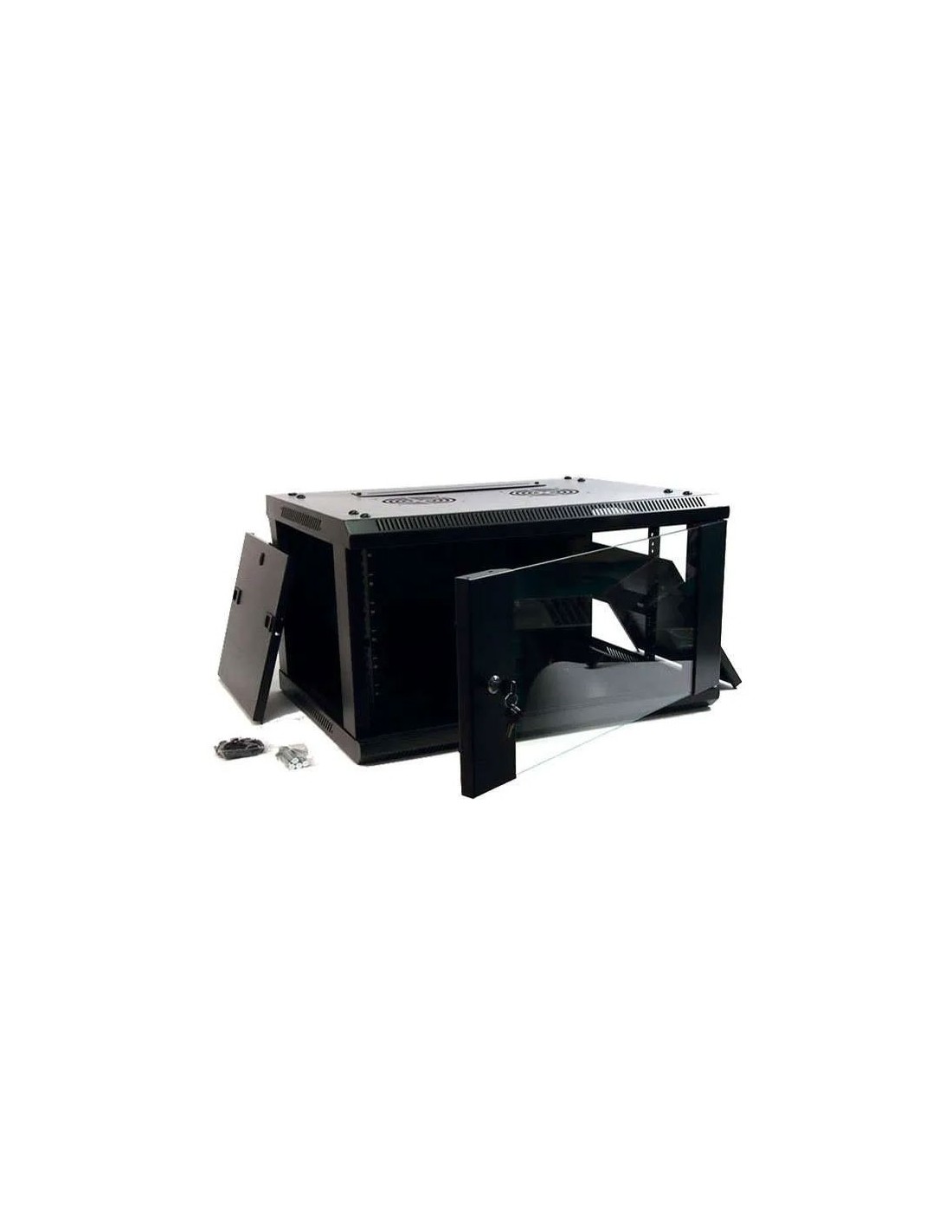 Armario Rack 19" tipo mural de 4U. Fabricado en SPCC acero laminado en frío. Cerradura de seguridad con llave. 60 kg de carga. Se suministra sin accesorios