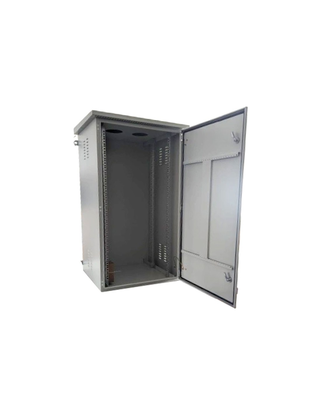 Rack exterior 22U para aplicaciones industriales o telecomunicaciones. Estructura en acero galvanizado SPCC. Protección IP55. Doble ventilador superior, bandeja fija, termostato, cerradura de seguridad y alta resistencia UV y a la corrosión