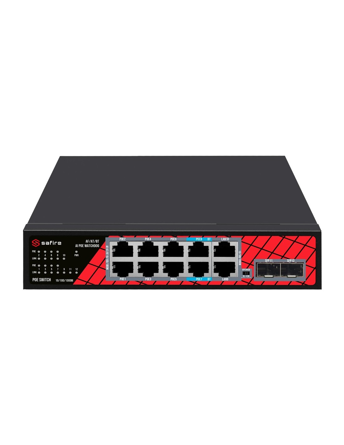 Safire Switch Hi-PoE - 8 puertos PoE + 2 SFP + 2 RJ45 - Velocidad de puertos Gigabit 10/100/1000Mbps - 6 Puertos PoE+ 30W + 2 Puertos Hi-PoE 60W - PoE Watchdog - Hasta 120W Potencia PoE total