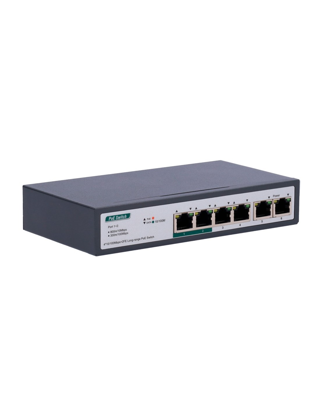 Switch PoE - 4 puertos PoE+ FE + 2 FE Uplink - Velocidad 4 x10/100Mbps + 2 x10/100Mbps - 2 Puertos PoE para hasta 800m con accesorio - Hasta 60 W de Potencia Total PoE - Norma IEEE802.3at PoE / af PoE+