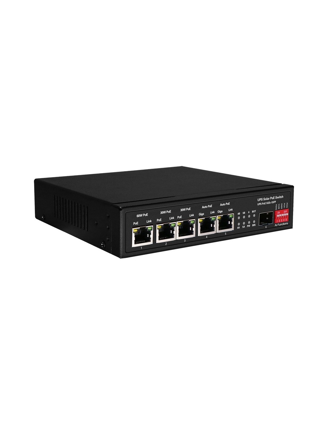 Switch PoE - 5 puertos PoE + 1 SFP - Velocidad de puertos 10/100/1000 Mbps - 1xHi-PoE (60W) + 2xPoE+ (30W) + 2x24/48V (25W) - Hasta 65W de Potencia PoE total - Soporta baterías de 12V/24V y paneles de 400W