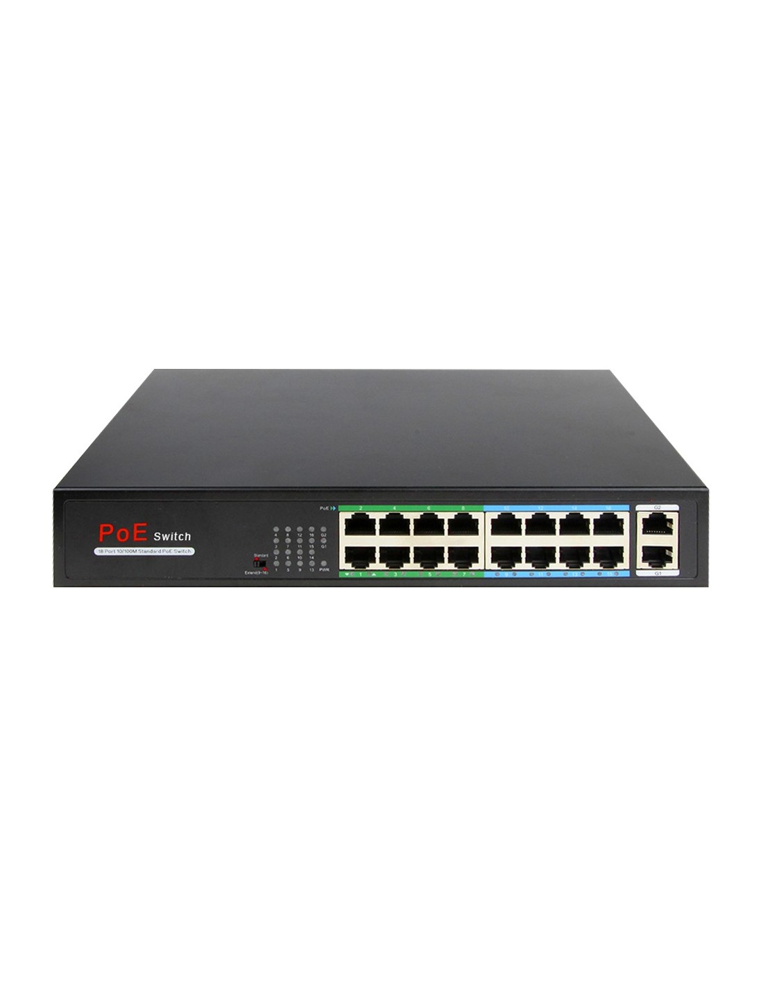 - 16 puertos PoE+ RJ45 10/100 Mbps + 2 Puertos RJ45 Uplink 10/100/1000 Mbps