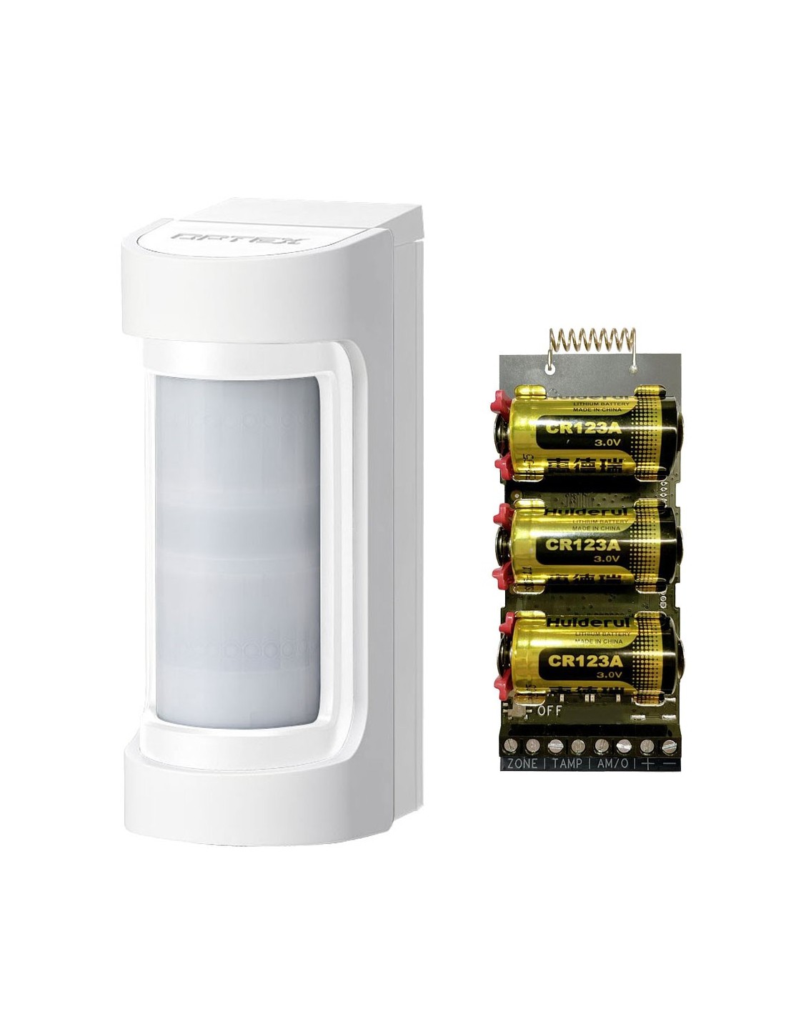 Detector doble tecnología doble PIR + Microondas autoalimentado Exterior Antimasking Optex + Transmisor vía Radio AXPRO | Antimasking IR activo. SMDA contra falsas alarmas. Nivel incorporado. Antimascotas. IP55 | Rango ajustable 5 niveles Sensibilidad 3 niveles | Transmisor vía radio 1 entrada Hikvision. LED estado | Diseño compacto | para colocar en detector cableado | Salida voltaje 3.3v 10mA (encendido detector cableado externo)