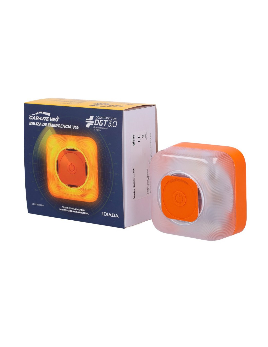 Baliza V16 homologada por la DGT con base imantada adherente. Activación con 1 solo botón y visibilidad hasta 1km. Protección IP 54 y pilas AA reemplazables.