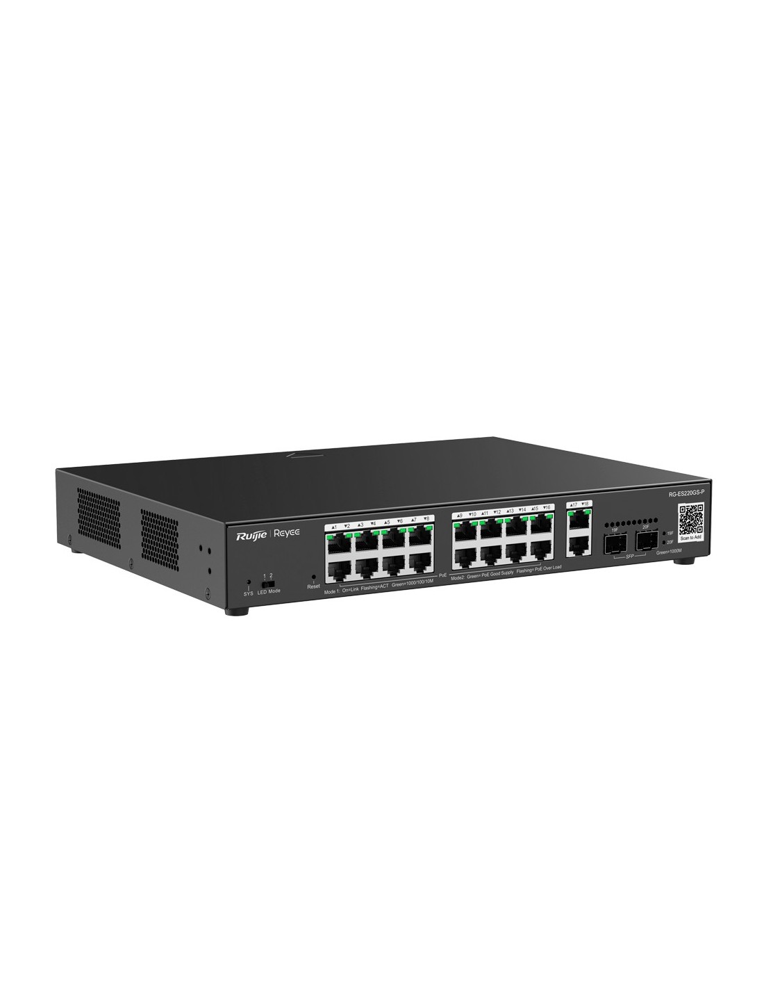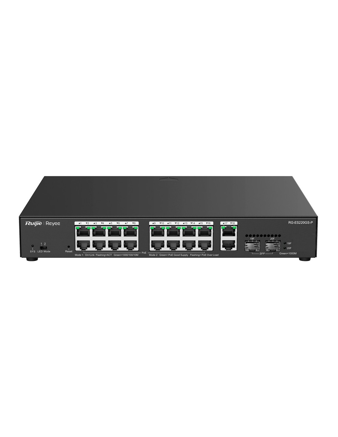 Reyee Switch PoE Cloud Gestionable - 16 PoE 802.3af/at + 2 SFP + 2 uplink RJ45 - 18 RJ45 10/100/1000Mbps + 2 SFP 10/100/1000 - 30W por puerto 802.3af/at / Máximo 250W - VLAN/Port Isolation/Loop Detection - Port Speed Limit