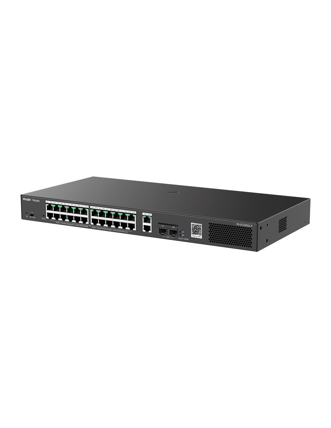Reyee Switch PoE Cloud Gestionable - 24 PoE 802.3af/at + 2 SFP + 2 uplink RJ45 - 26 RJ45 10/100/1000Mbps + 2 SFP 10/100/1000 - 30W por puerto 802.3af/at / Máximo 370W - VLAN/Port Isolation/Loop Detection - Port Speed Limit